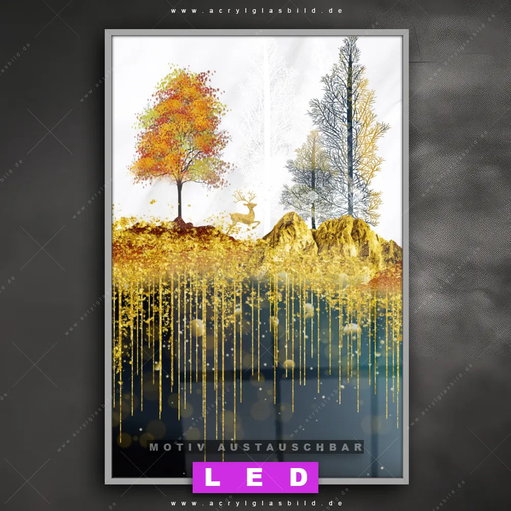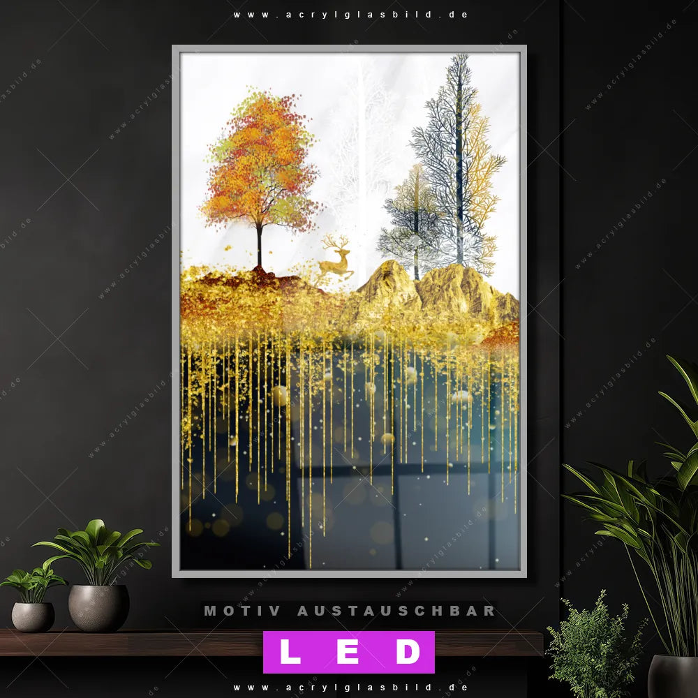 Wer braucht schon langweilige Wände, wenn man sie mit unserem LED Acrylglasbild Canvalight® DIA Wald in gold aufpeppen kann? Dank der genialen LED-Ausleuchtung wirst du in Wohnzimmer - Schlafzimmer, Bar - Gastronomie, Arzt - Praxis, Büro - Kanzlei nie wieder über deine eigenen Füße stolpern. Wenn du nach einem beleuchteten Wandbild aus Acrylglas mit Abstrakt, Modern, Kunst, Landschaft, Bäume, Tiere, Wald, Hirsch, Rotwild, Berge suchst, dann ist unser LED Acrylglasbild goldener Farblauf vom Wald in den hammermäßigen Motiv-Farben Weiss, Schwarz, Beige, Gold, Ocker, Orange genau das richtige LED Bild für dich. Im coolen Abstrakt, Modern Art Stil gestaltet, passt das LED Leuchtbild mit DIA-Klapprahmen und glänzender Front aus Acrylglas perfekt zu jedem Einrichtungsstil – sogar zu deinem chaotischen Kreativlabor!