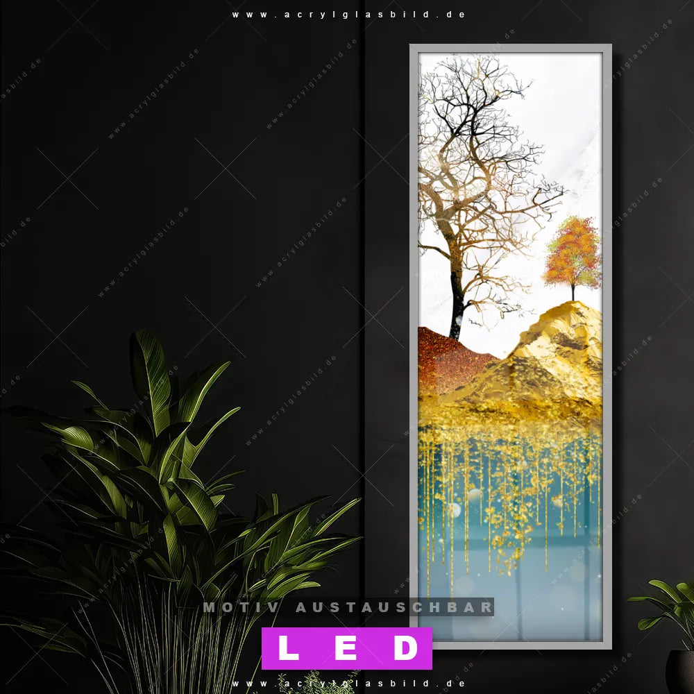 Vergiss dunkle Ecken und langweilige Wände in Wohnzimmer - Schlafzimmer, Bar - Gastronomie, Arzt - Praxis, Büro - Kanzlei! Mit unserem LED Acrylglasbild Canvalight® DIA Wald in gold wirst du nie wieder im Dunkeln tappen. Suchst du nach einem beleuchteten Wandbild mit Abstrakt, Modern, Kunst, Landschaft, Bäume, Tiere, Wald, Hirsch, Rotwild, Berge? Dann ist unser Leuchtbild goldener Farblauf vom Wald mit den strahlenden Motiv-Farben Weiss, Schwarz, Beige, Gold, Ocker, Orange genau das richtige LED Bild für dich. Egal, ob dein Stil minimalistisch oder exotisch ist, dieses LED Leuchtbild im Abstrakt, Modern Art Stil mit DIA-Klapprahmen und glänzender Front aus Acrylglas passt perfekt zu jeder Einrichtung.