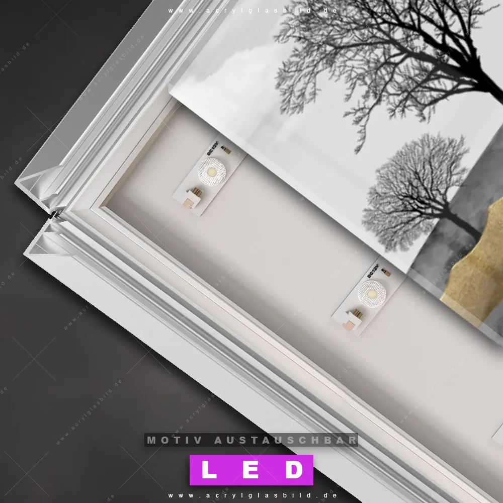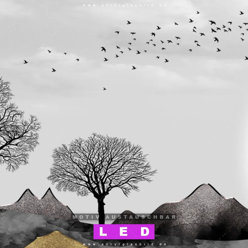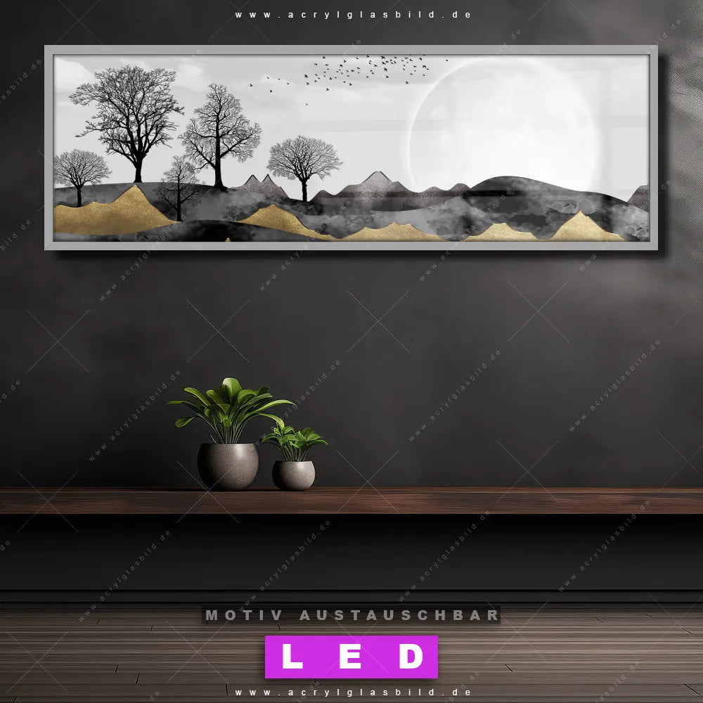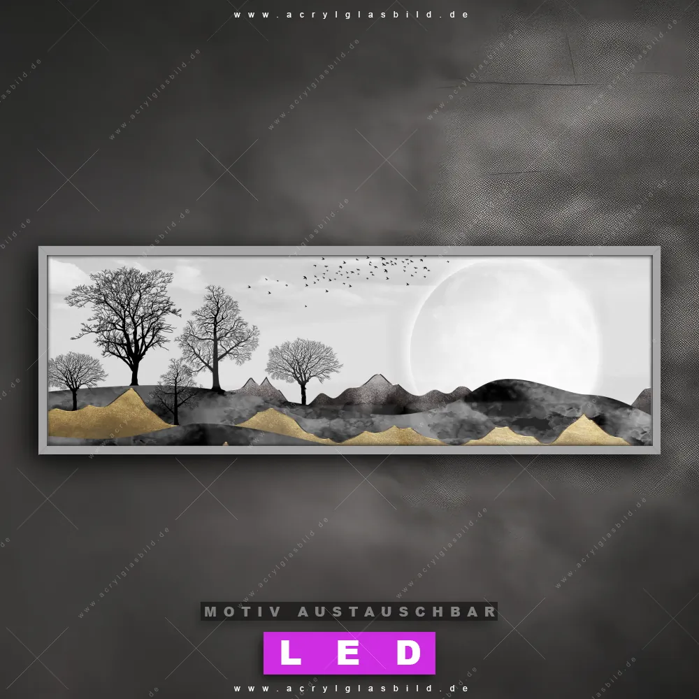 Wer will schon dunkle, triste Wände? Mit unserem LED Acrylglasbild Canvalight® DIA schwarz-goldene Landschaft und seiner fantastischen LED-Ausleuchtung werden deine Wände in Wohnzimmer - Schlafzimmer, Bar - Gastronomie, Arzt - Praxis, Büro - Kanzlei zu echten Hinguckern. Wenn du auf der Suche nach einem beleuchteten Wandbild aus Acrylglas mit Abstrakt, Modern, Kunst, Landschaft, Bäume, Wald, Berge, Vögel bist, dann solltest du unser LED Leuchhtbild Berge mit blattlosen Bäumen mit den beeindruckenden Motiv-Farben Weiss, Schwarz, Beige, Gold nicht verpassen. Gestaltet im angesagten Abstrakt, Modern Art, Schwarz - Weiss Stil, passt das LED Bild mit DIA-Klapprahmen und wechselbarer Acrylglas-Scheibe perfekt zu jedem Einrichtungsstil – selbst in deinem kleinen Dschungel aus Kreativität und Chaos!