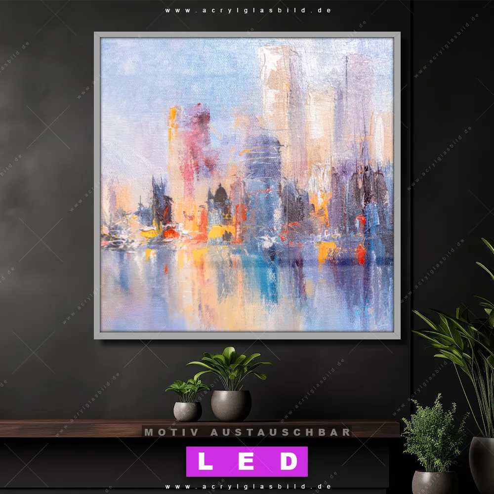 Bist du bereit, deine Wände mit einem dimmbaren LED Bild mit Fernbedienung und optionaler Farbtemperatursteuerung zum Leuchten zu bringen? Wir haben das ultimative Städte - Skylines LED Acrylglasbild Canvalight® DIA für dich! Unser LED Wandbild aus Acrylglas Abstrakte Skyline No.2 im Quadratischen Format mit austauschbarer bedruckter Acrylglas-Scheibe im DIA-Klapprahmen bringt sofort jede Menge Glanz in deine vier Wände.