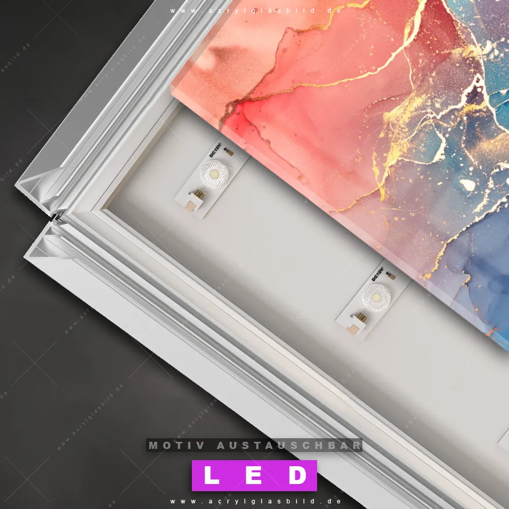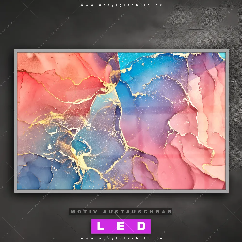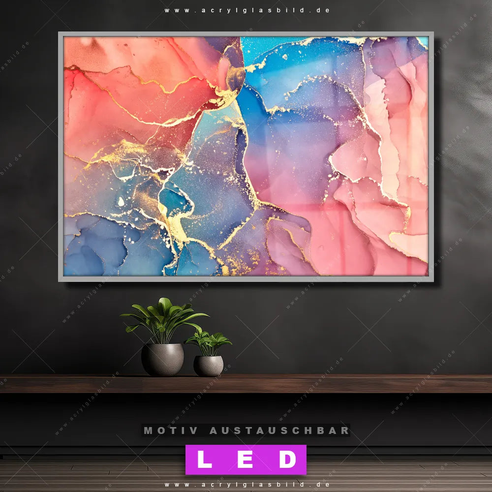 Mit unserem LED Acrylglasbild Canvalight® DIA verlaufende Farben mit Goldpuder und seiner genialen LED-Ausleuchtung wirst du nie wieder im Dunkeln auf deinem Sofa herumtappen. Wenn du nach einem beleuchteten Wandbild aus Acrylglas mit Marmor, Flüssigkeit, Acryl, flüssig, Farbe, Marmorierung, Fluid Art für Arzt - Praxis, Büro - Kanzlei, Wohnzimmer - Schlafzimmer, Bar - Gastronomie, Friseur - Beauty suchst, ist unser LED Leuchtbild Goldeffekte auf Wasserfarben in den beeindruckenden Motiv-Farben Gold, Rosa, Hellblau, Blau genau das richtige beleuchtete Wandbild für dich. Gestaltet im Abstrakt, Modern Art Stil, passt dieses LED Wandbild mit DIA-Klapprahmen und glänzender Front aus Acrylglas perfekt zu jedem Einrichtungsstil – sogar zu deinem chaotischen kreativen Durcheinander!
