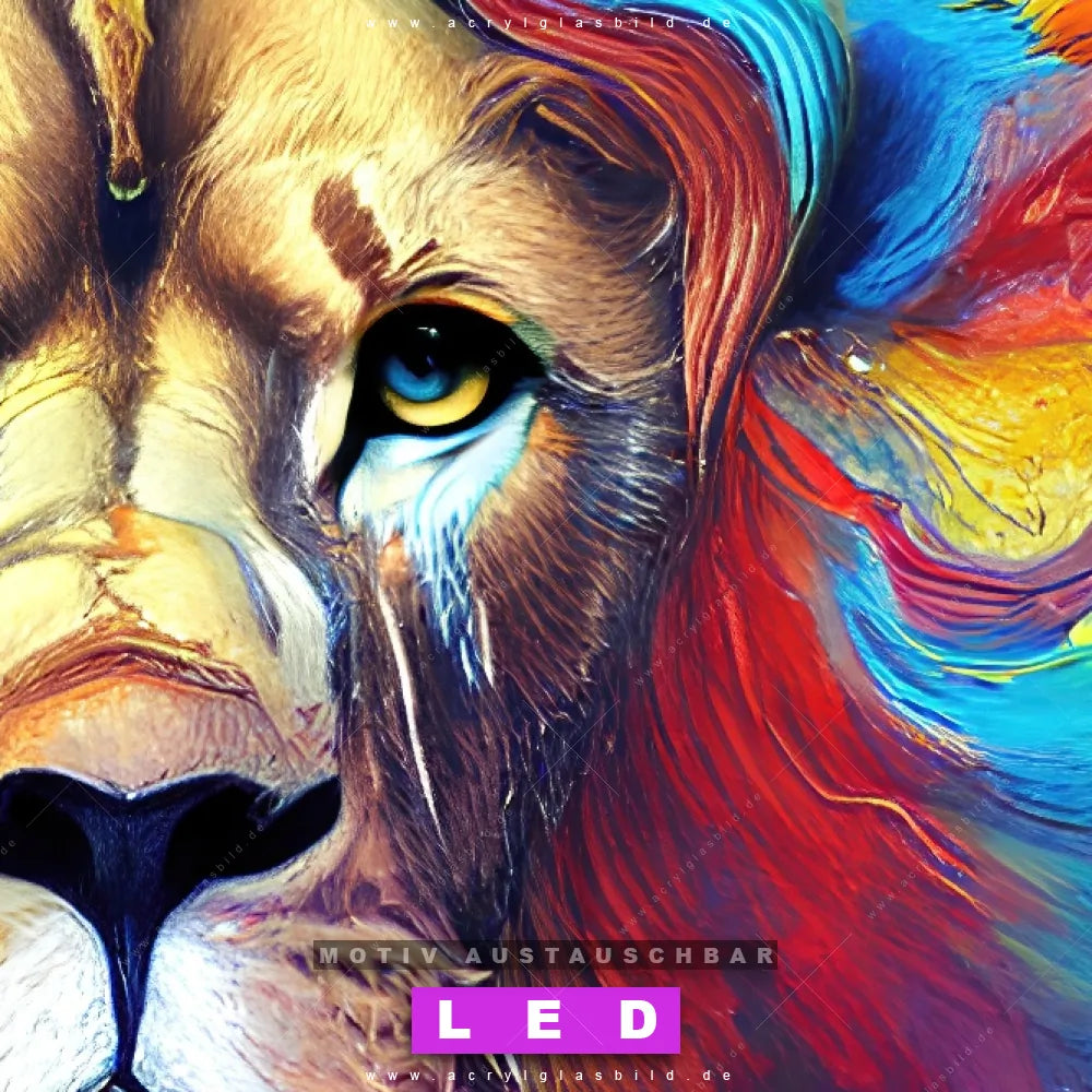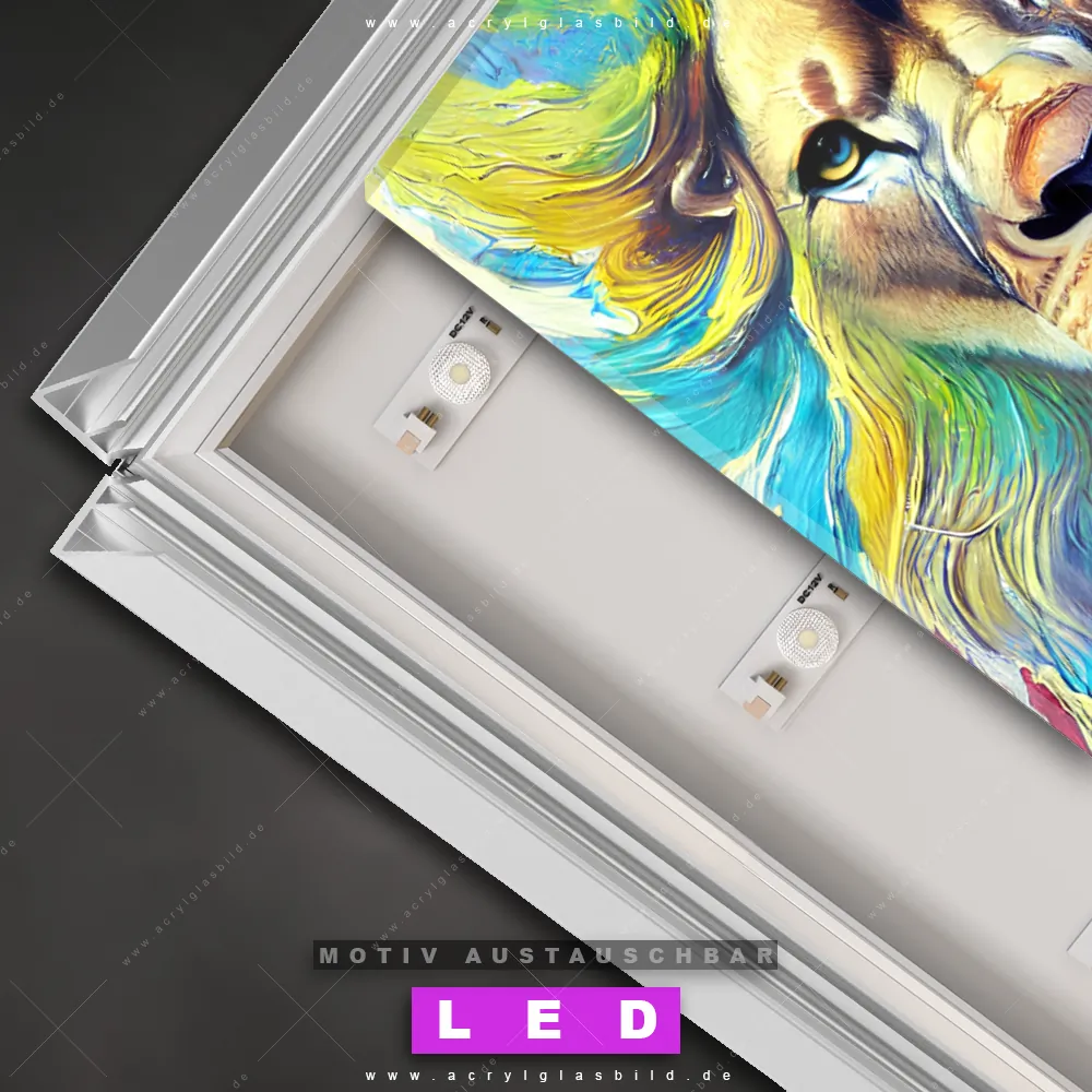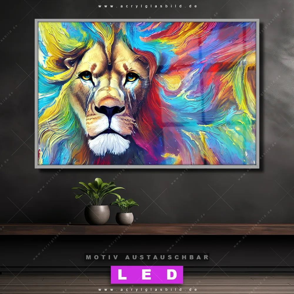 Du bist auf der Suche nach einem dimmbaren Tierwelt LED Bild mit Fernbedienung und optionaler Farbtemperatursteuerung? Dann haben wir hier genau das richtige Wandbild mit LED Beleuchtung für dich: Unser Canvalight® DIA LED Acrylglasbild Abstrakter Löwenkopf im Querformat mit austauschbarer bedruckter Acrylglas-Scheibe. Dieses Leuchtbild bringt sofort Partybeleuchtung in deine Räume!