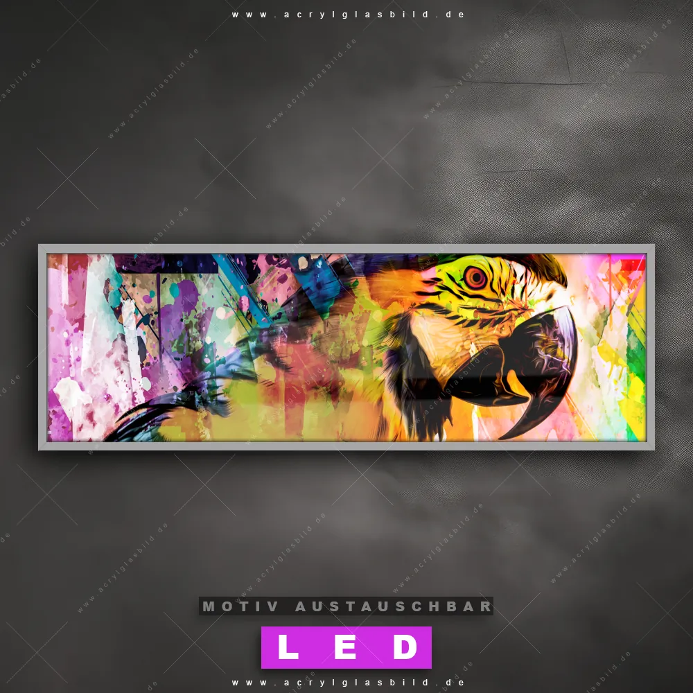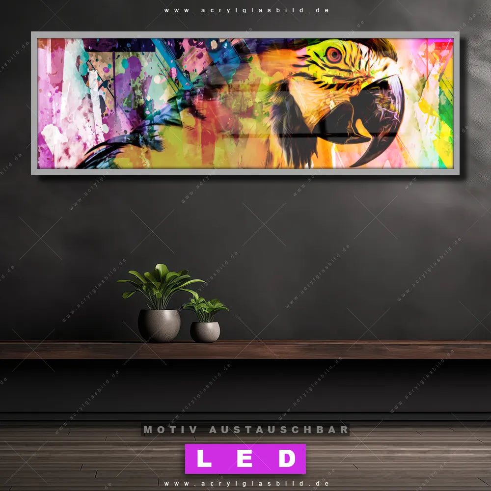 Deine Wände könnten dringend ein dimmbares LED Bild mit Fernbedienung und optionaler Farbtemperatursteuerung gebrauchen? Dann haben wir das perfekte Wandbild mit LED Beleuchtung für dich: unser mega-cooles Tierwelt Canvalight® DIA LED Acrylglasbild! Mit unserem angesagten Leuchtbild aus Acrylglas im Panorama-Format und der austauschbaren bedruckten Acrylglas-Scheibe Abstrakter Papagei bringst du nicht nur Licht, sondern auch jede Menge Flair in deine Räume.
