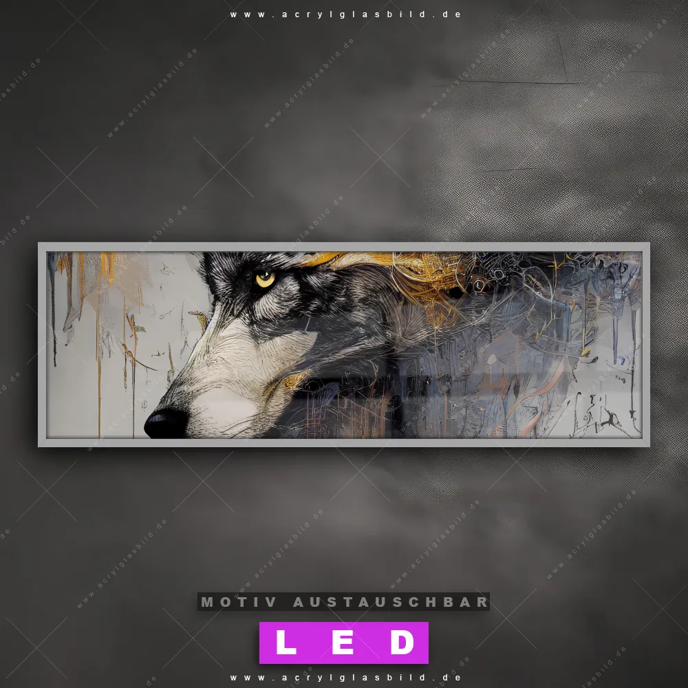 Deine Wände könnten dringend ein dimmbares LED Bild mit Fernbedienung und optionaler Farbtemperatursteuerung gebrauchen? Dann haben wir das perfekte Wandbild mit LED Beleuchtung für dich: unser mega-cooles Tierwelt Canvalight® DIA LED Acrylglasbild! Mit unserem angesagten Leuchtbild aus Acrylglas im Panorama-Format und der austauschbaren bedruckten Acrylglas-Scheibe Abstrakter Wolf in Gold und Grau bringst du nicht nur Licht, sondern auch jede Menge Flair in deine Räume.