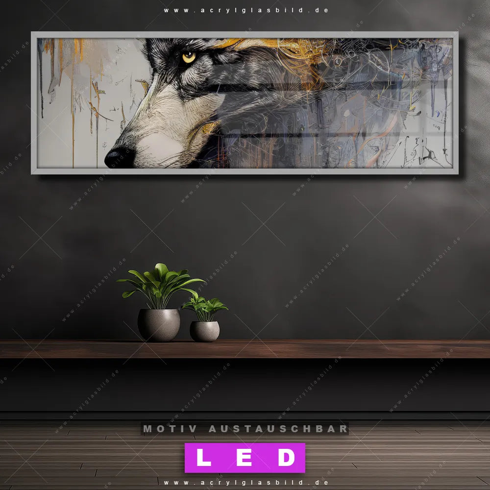 LED Acrylglasbild Canvalight® DIA | Abstrakter Wolf in Gold und Grau | Panorama