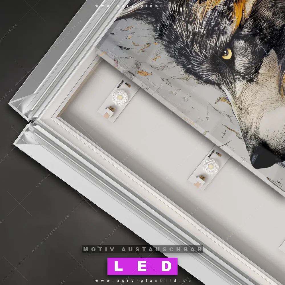 Also, worauf wartest du noch? Gib mit einem beleuchteten Wandbild mit wechselbarer Acrylglas-Scheibe deinen Wänden das gewisse Etwas und bestelle jetzt das LED Acrylglasbild Canvalight® DIA Wolfskopf mit Goldakzenten – dein Zuhause wird es dir danken und deine Freunde werden dank der wechselbaren Motive erblassen!