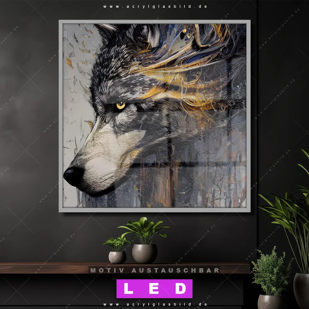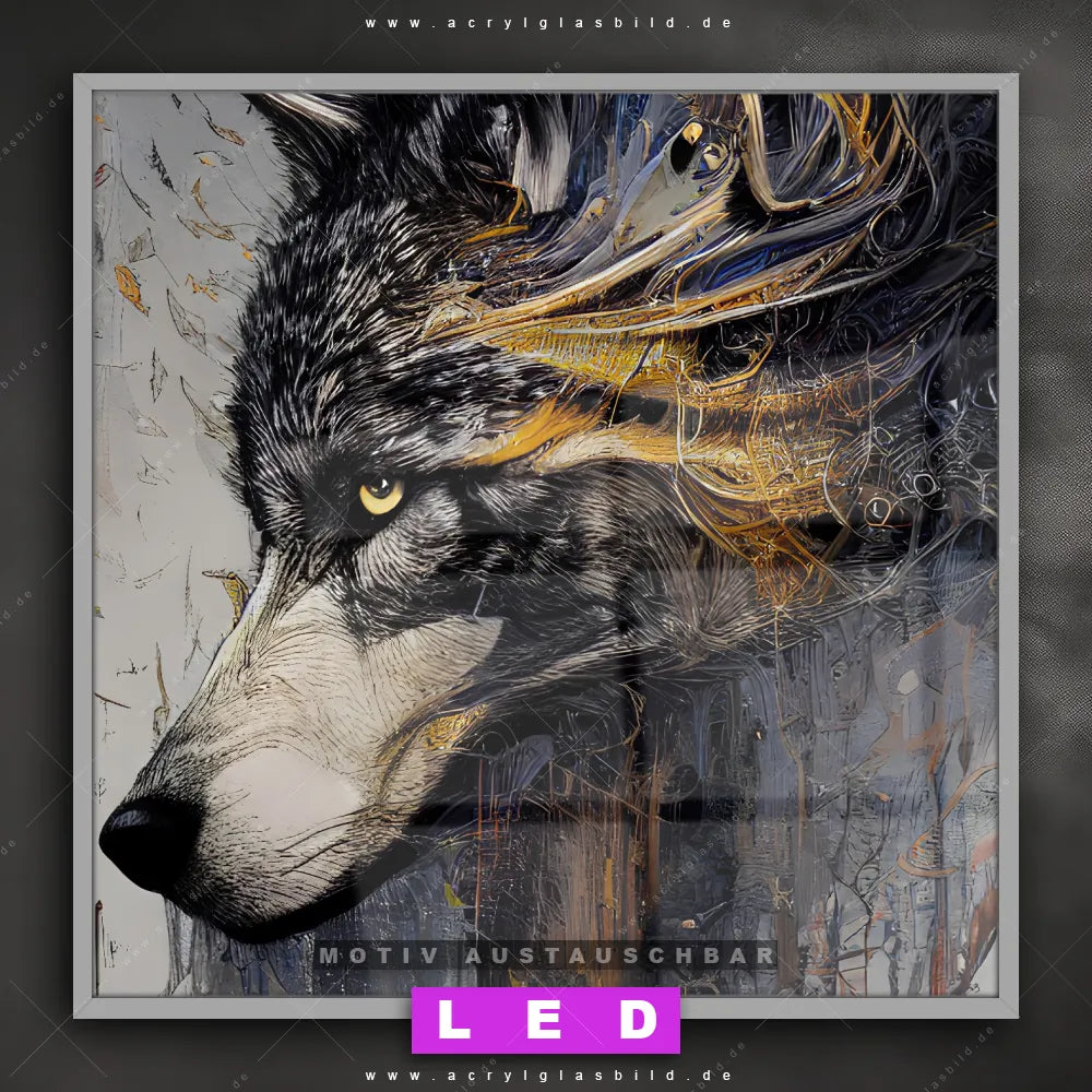 Bist du bereit, deine Wände mit einem dimmbaren LED Bild mit Fernbedienung und optionaler Farbtemperatursteuerung zum Leuchten zu bringen? Wir haben das ultimative Tierwelt LED Acrylglasbild Canvalight® DIA für dich! Unser LED Wandbild aus Acrylglas Abstrakter Wolf in Gold und Grau im Quadratischen Format mit austauschbarer bedruckter Acrylglas-Scheibe im DIA-Klapprahmen bringt sofort jede Menge Glanz in deine vier Wände.