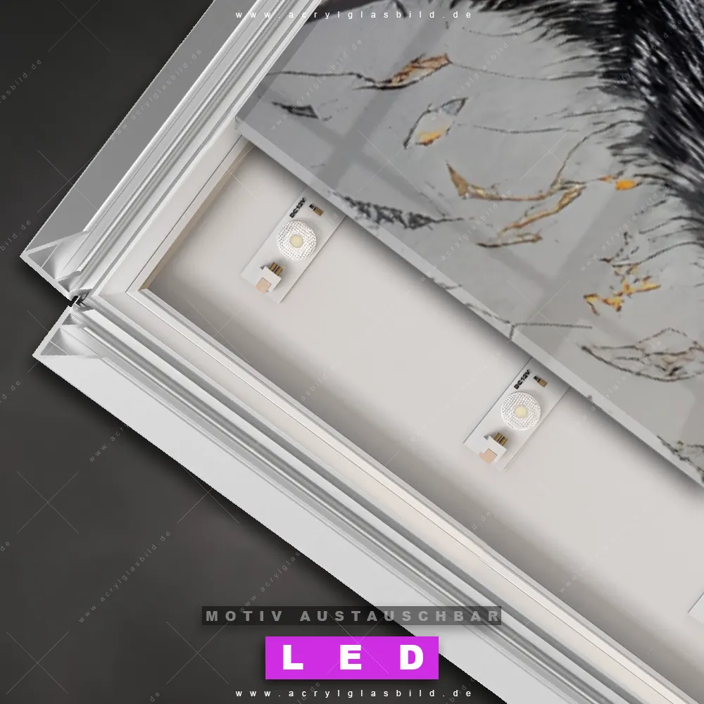 Bist du bereit, deine Wände mit einem dimmbaren LED Bild mit Fernbedienung und optionaler Farbtemperatursteuerung auf das nächste Level zu bringen? Unser Tierwelt Canvalight® DIA LED Acrylglasbild ist genau das, was du brauchst! Das Wandbild mit LED Beleuchtung im Schmalen Format mit austauschbarer bedruckter Acrylglas-Scheibe Abstrakter Wolf in Gold und Grau bringt Licht und Stil in dein Zuhause – und das in null Komma nichts!
