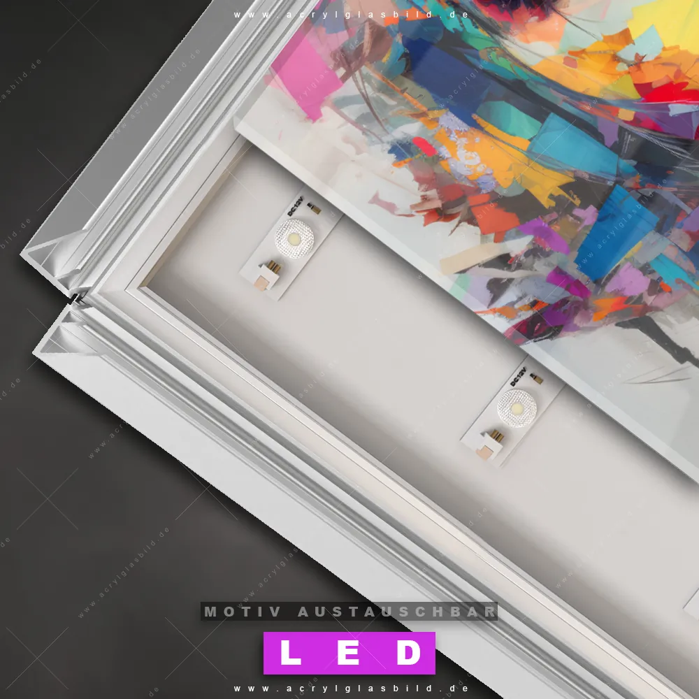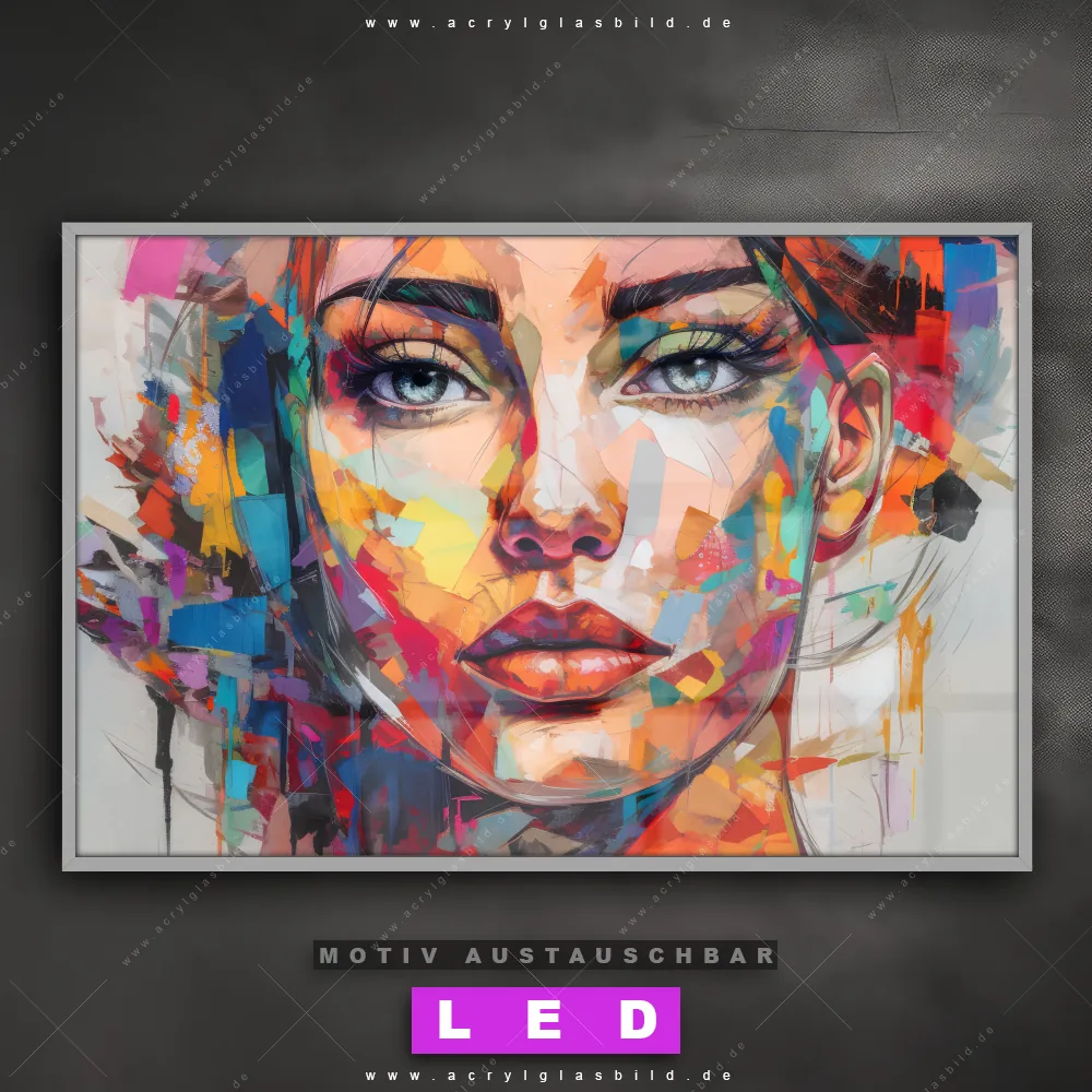 Du bist auf der Suche nach einem dimmbaren Porträts - Menschen LED Bild mit Fernbedienung und optionaler Farbtemperatursteuerung? Dann haben wir hier genau das richtige Wandbild mit LED Beleuchtung für dich: Unser Canvalight® DIA LED Acrylglasbild Abstraktes Frauenporträt Aurora im Querformat mit austauschbarer bedruckter Acrylglas-Scheibe. Dieses Leuchtbild bringt sofort Partybeleuchtung in deine Räume!