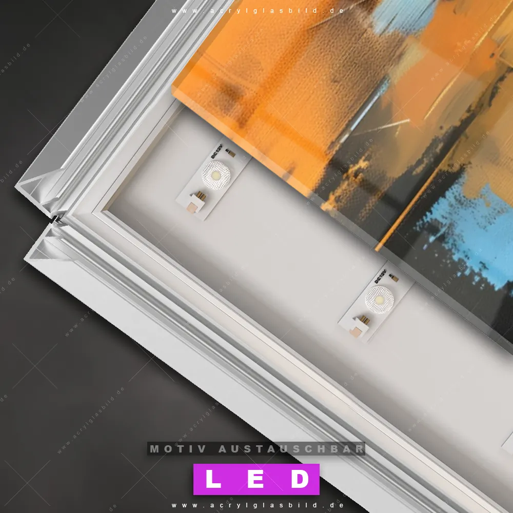 Wer will schon dunkle, triste Wände? Mit unserem LED Acrylglasbild Canvalight® DIA Abstrakte Schönheit und seiner fantastischen LED-Ausleuchtung werden deine Wände in Friseur - Beauty, Flur - Eingangsbereich, Wohnzimmer - Schlafzimmer, Bar - Gastronomie, Arzt - Praxis zu echten Hinguckern. Wenn du auf der Suche nach einem beleuchteten Wandbild aus Acrylglas mit Kunst, Frau, Portrait, Gesicht, Mädchen, Dame, Acryl, Schönheit, Farbe bist, dann solltest du unser LED Leuchhtbild Abstraktes Gesicht einer Frau mit den beeindruckenden Motiv-Farben Orange, Schwarz, Blau, Weiss, Lila nicht verpassen. Gestaltet im angesagten Abstrakt, Modern Art Stil, passt das LED Bild mit DIA-Klapprahmen und wechselbarer Acrylglas-Scheibe perfekt zu jedem Einrichtungsstil – selbst in deinem kleinen Dschungel aus Kreativität und Chaos!