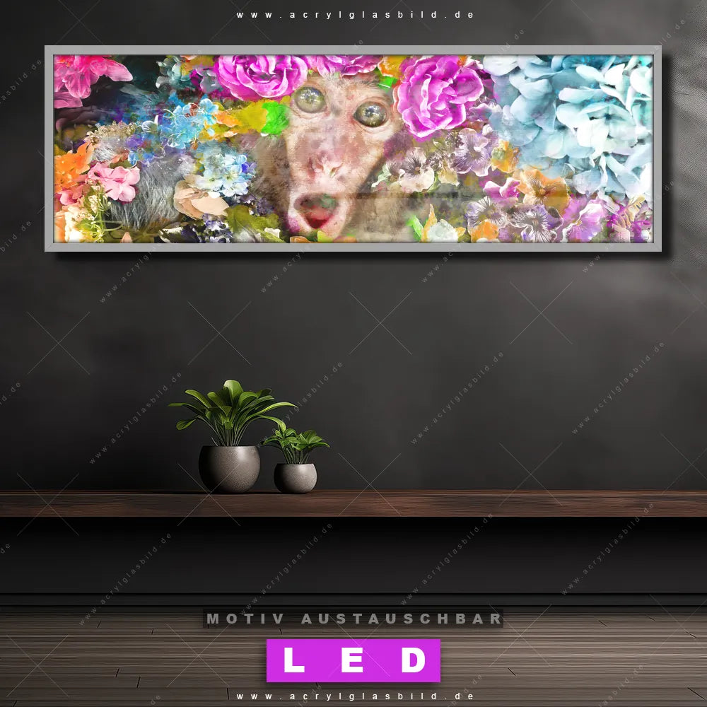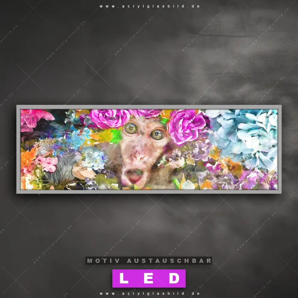 Also, worauf wartest du noch? Verwandle deine Wände mit einem LED Leuchtbild in wahre Kunstwerke und bestelle jetzt das Canvalight® DIA LED Acrylglasbild Verspieltes Äffchen zwischen farbigen Blüten. Deine Wände werden strahlen, und deine Freunde werden dank der wechselbaren Motive staunen!