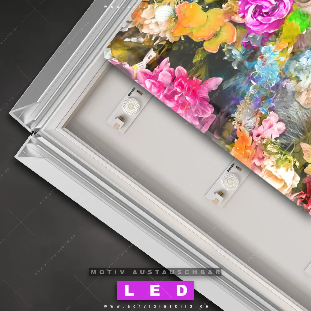 Mit unserem LED Acrylglasbild Canvalight® DIA Verspielter Affe im Blumenmeer und seiner genialen LED-Ausleuchtung wirst du nie wieder im Dunkeln auf deinem Sofa herumtappen. Wenn du nach einem beleuchteten Wandbild aus Acrylglas mit Tiere & Blumen, Tier, Blumen, Kunst, Aquarell, Affe, Monkey, Blüten für Wohnzimmer - Schlafzimmer, Arzt - Praxis, Bar - Gastronomie, Büro - Kanzlei, Flur - Eingangsbereich suchst, ist unser LED Leuchtbild Zauberhaftes Äffchen umhüllt von Blumen in den beeindruckenden Motiv-Farben Bunt genau das richtige beleuchtete Wandbild für dich. Gestaltet im Floral, Modern Art Stil, passt dieses LED Wandbild mit DIA-Klapprahmen und glänzender Front aus Acrylglas perfekt zu jedem Einrichtungsstil – sogar zu deinem chaotischen kreativen Durcheinander!