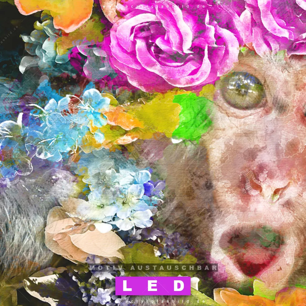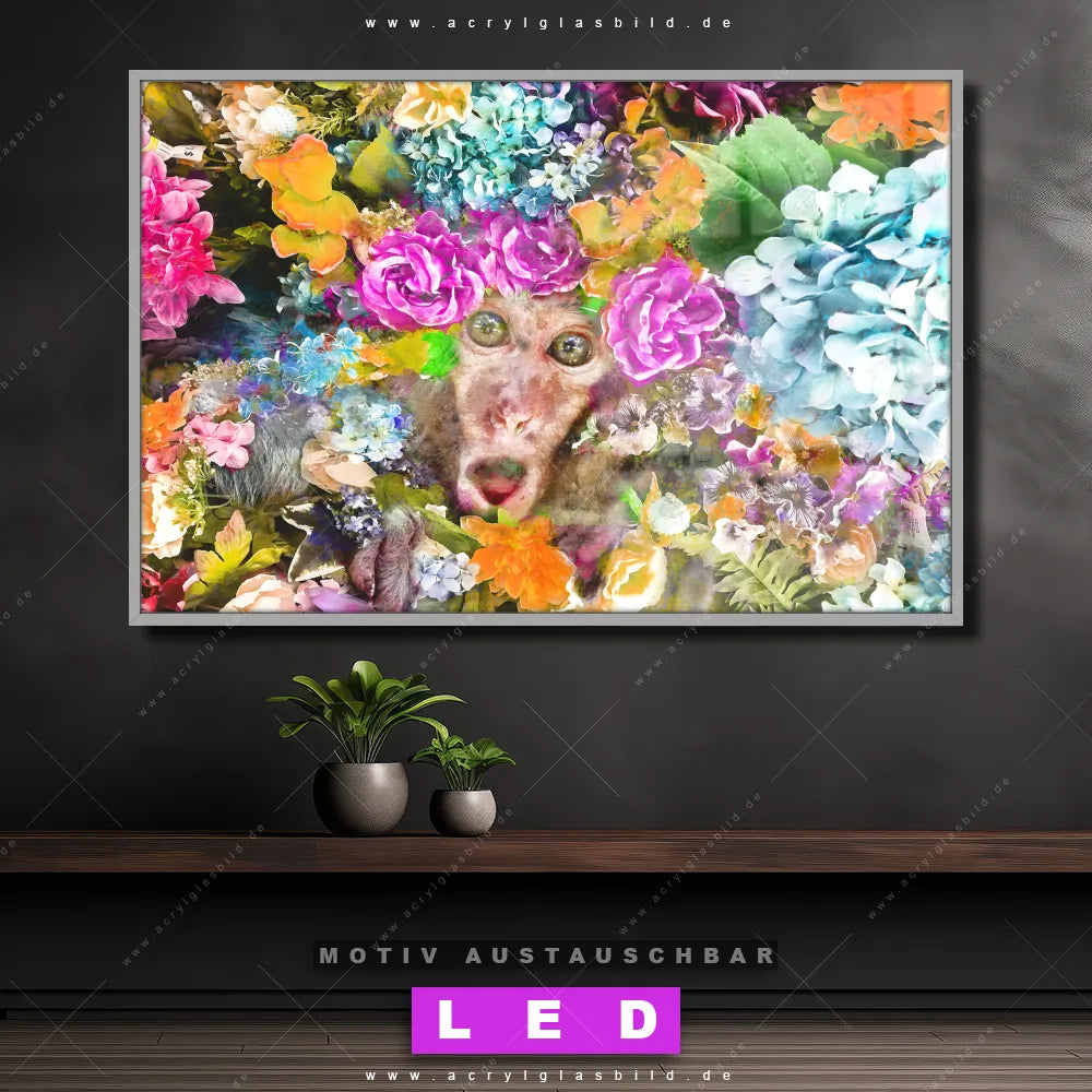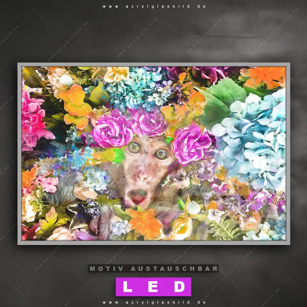 Du bist auf der Suche nach einem dimmbaren Tierwelt, Blumen - Botanik LED Bild mit Fernbedienung und optionaler Farbtemperatursteuerung? Dann haben wir hier genau das richtige Wandbild mit LED Beleuchtung für dich: Unser Canvalight® DIA LED Acrylglasbild Äffchen & Blumen im Querformat mit austauschbarer bedruckter Acrylglas-Scheibe. Dieses Leuchtbild bringt sofort Partybeleuchtung in deine Räume!
