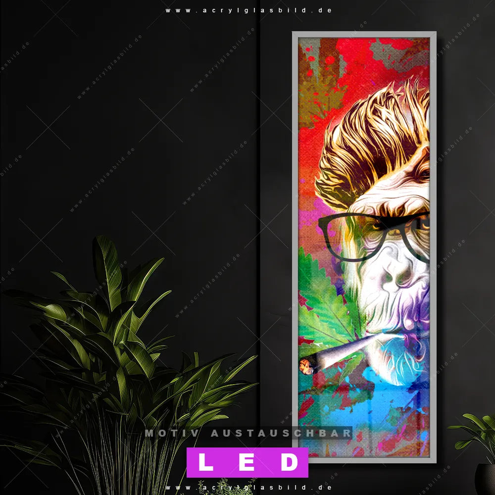 Vergiss dunkle Ecken und langweilige Wände in Bar - Gastronomie, Wohnzimmer - Schlafzimmer! Mit unserem LED Acrylglasbild Canvalight® DIA rauchender Affe mit Brille wirst du nie wieder im Dunkeln tappen. Suchst du nach einem beleuchteten Wandbild mit Tier, Affe, Monkey, Brille, Sonnenbrille, cool, Zigarette, rauchen, Cannabis, Piercing? Dann ist unser Leuchtbild Affe mit roten Augen in bunter Umgebung mit den strahlenden Motiv-Farben Bunt genau das richtige LED Bild für dich. Egal, ob dein Stil minimalistisch oder exotisch ist, dieses LED Leuchtbild im Abstrakt, Mixed Media, Modern Art, Pop Art, Street Art Stil mit DIA-Klapprahmen und glänzender Front aus Acrylglas passt perfekt zu jeder Einrichtung.