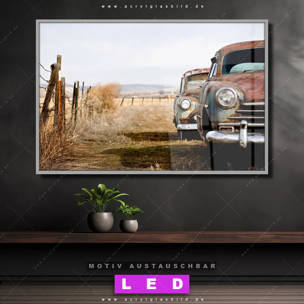 Du bist auf der Suche nach einem dimmbaren Fahrzeuge LED Bild mit Fernbedienung und optionaler Farbtemperatursteuerung? Dann haben wir hier genau das richtige Wandbild mit LED Beleuchtung für dich: Unser Canvalight® DIA LED Acrylglasbild Alte rostige Autos im Querformat mit austauschbarer bedruckter Acrylglas-Scheibe. Dieses Leuchtbild bringt sofort Partybeleuchtung in deine Räume!