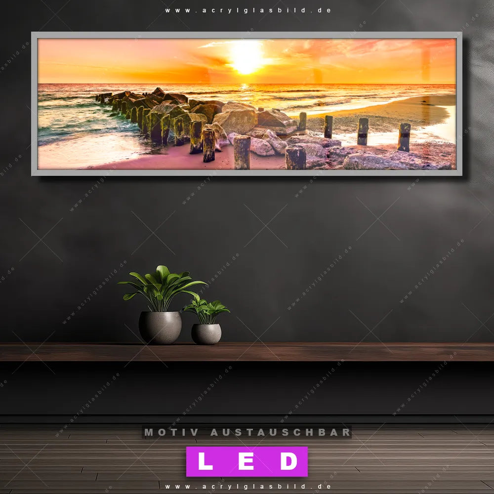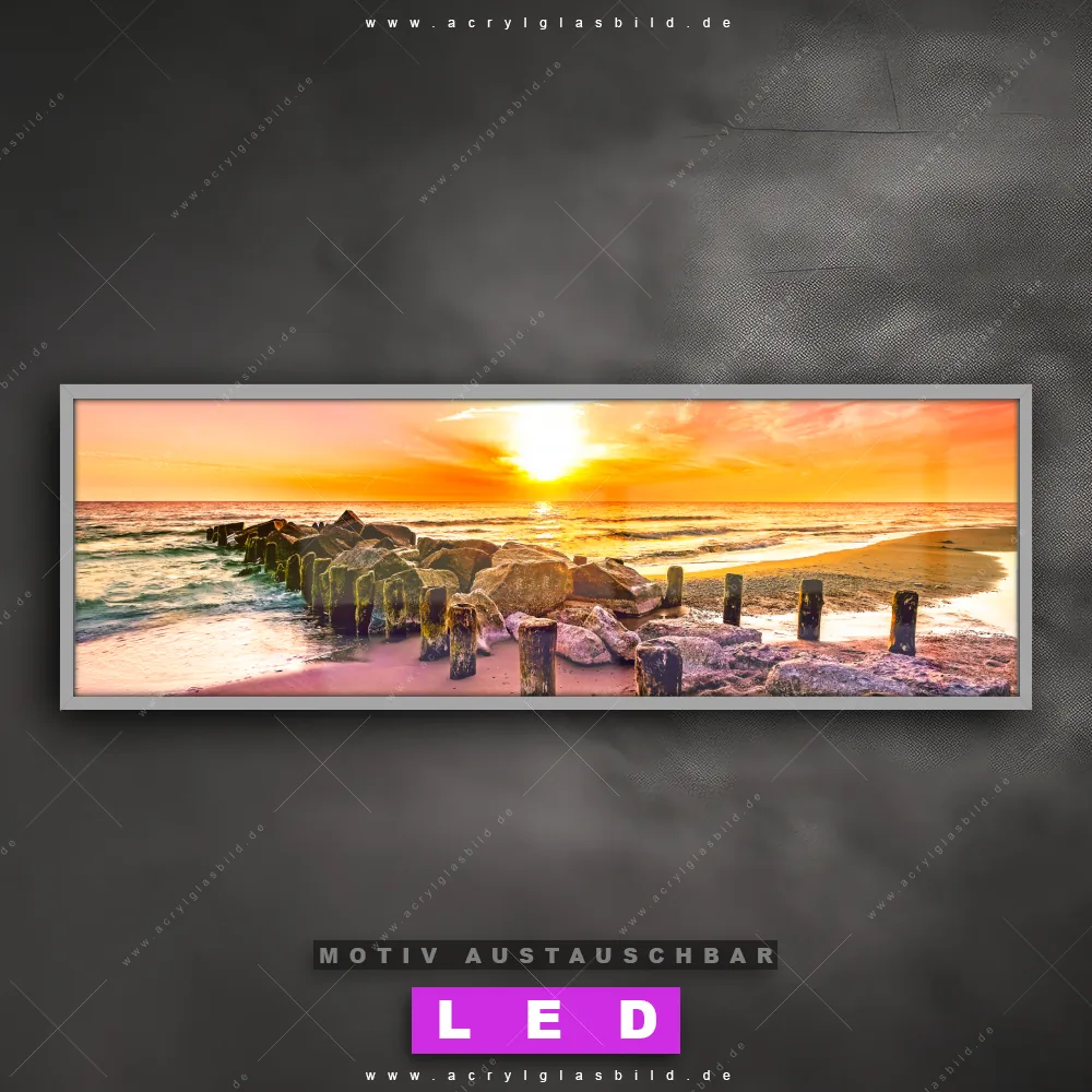 Wer will schon dunkle, triste Wände? Mit unserem LED Acrylglasbild Canvalight® DIA Sonnenuntergang am Strand vor Buhne und seiner fantastischen LED-Ausleuchtung werden deine Wände in Arzt - Praxis, Büro - Kanzlei, Wohnzimmer - Schlafzimmer zu echten Hinguckern. Wenn du auf der Suche nach einem beleuchteten Wandbild aus Acrylglas mit Meer, Sonnenuntergang, Strand, Buhne, Küste, Felsen bist, dann solltest du unser LED Leuchhtbild Strand mit Steinen und Holzpfosten mit den beeindruckenden Motiv-Farben Orange, Beige, Blau nicht verpassen. Gestaltet im angesagten Natürlich - Realistisch Stil, passt das LED Bild mit DIA-Klapprahmen und wechselbarer Acrylglas-Scheibe perfekt zu jedem Einrichtungsstil – selbst in deinem kleinen Dschungel aus Kreativität und Chaos!