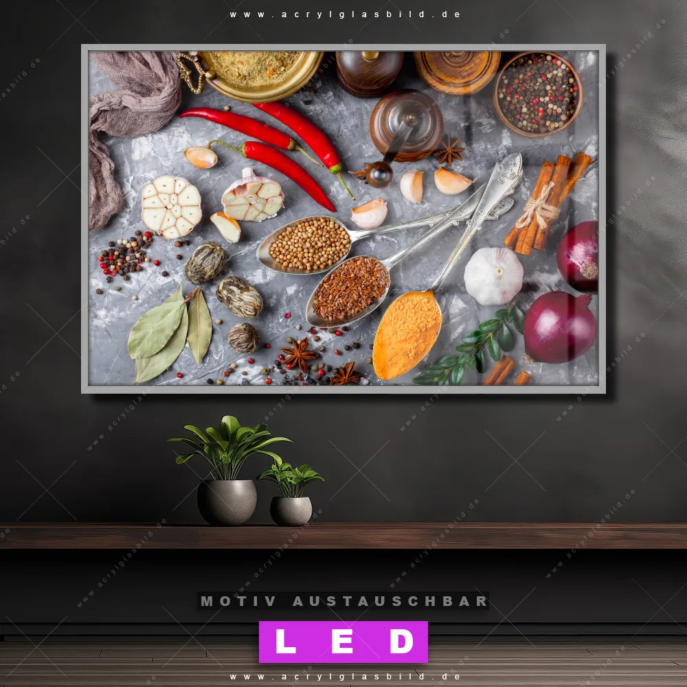 Du bist auf der Suche nach einem dimmbaren Essen - Trinken LED Bild mit Fernbedienung und optionaler Farbtemperatursteuerung? Dann haben wir hier genau das richtige Wandbild mit LED Beleuchtung für dich: Unser Canvalight® DIA LED Acrylglasbild Aromatische Gewürze im Querformat mit austauschbarer bedruckter Acrylglas-Scheibe. Dieses Leuchtbild bringt sofort Partybeleuchtung in deine Räume!