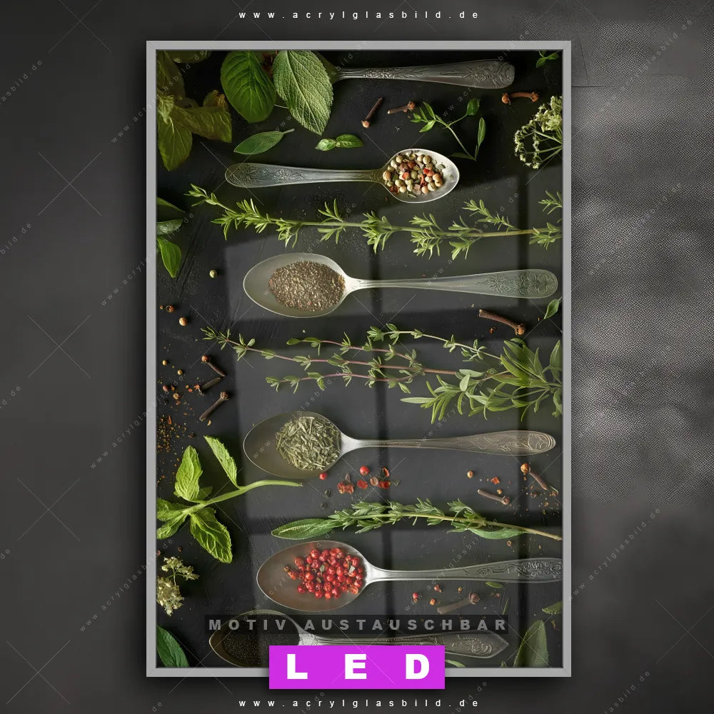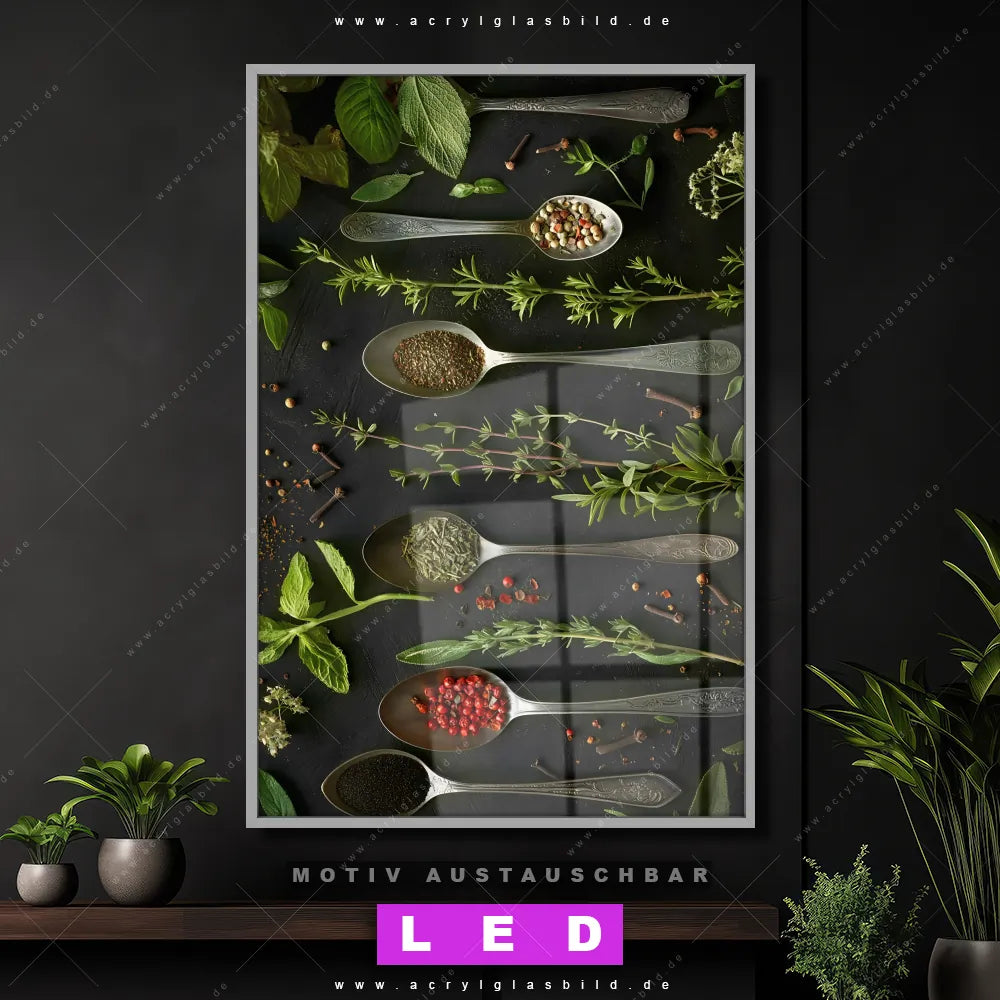 Wer braucht schon langweilige Wände, wenn man sie mit unserem LED Acrylglasbild Canvalight® DIA Löffel mit Gewürzen aufpeppen kann? Dank der genialen LED-Ausleuchtung wirst du in Bar - Gastronomie, Küche - Esszimmer nie wieder über deine eigenen Füße stolpern. Wenn du nach einem beleuchteten Wandbild aus Acrylglas mit Löffel, Besteck, Kräuter, Gewürze, kochen, Zutaten, Lebensmittel, Geschmack, Aromen suchst, dann ist unser LED Acrylglasbild Kulinarische Vielfalt auf Löffeln in den hammermäßigen Motiv-Farben Silber, Schwarz, Grün genau das richtige LED Bild für dich. Im coolen Natürlich - Realistisch Stil gestaltet, passt das LED Leuchtbild mit DIA-Klapprahmen und glänzender Front aus Acrylglas perfekt zu jedem Einrichtungsstil – sogar zu deinem chaotischen Kreativlabor!