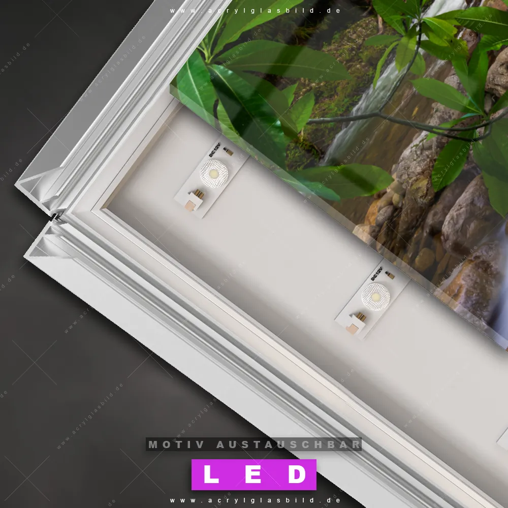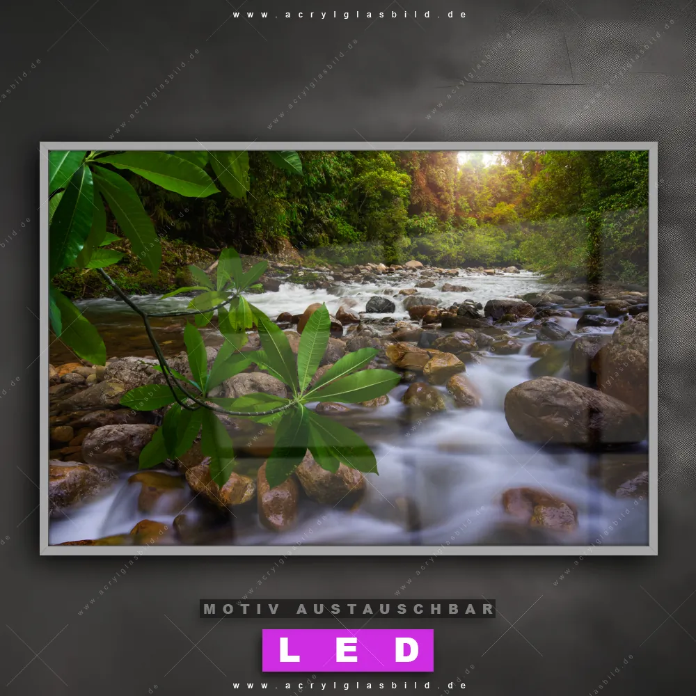 Mit unserem LED Acrylglasbild Canvalight® DIA Dschungel mit Fluss und seiner genialen LED-Ausleuchtung wirst du nie wieder im Dunkeln auf deinem Sofa herumtappen. Wenn du nach einem beleuchteten Wandbild aus Acrylglas mit Dschungel, Fluss, Bach, Steine, Natur, Wald für Arzt - Praxis, Büro - Kanzlei, Wohnzimmer - Schlafzimmer, Küche - Esszimmer, Bar - Gastronomie, Flur - Eingangsbereich suchst, ist unser LED Leuchtbild Tropenwald mit steinigem Bach in den beeindruckenden Motiv-Farben Grün, Braun genau das richtige beleuchtete Wandbild für dich. Gestaltet im Natürlich - Realistisch Stil, passt dieses LED Wandbild mit DIA-Klapprahmen und glänzender Front aus Acrylglas perfekt zu jedem Einrichtungsstil – sogar zu deinem chaotischen kreativen Durcheinander!
