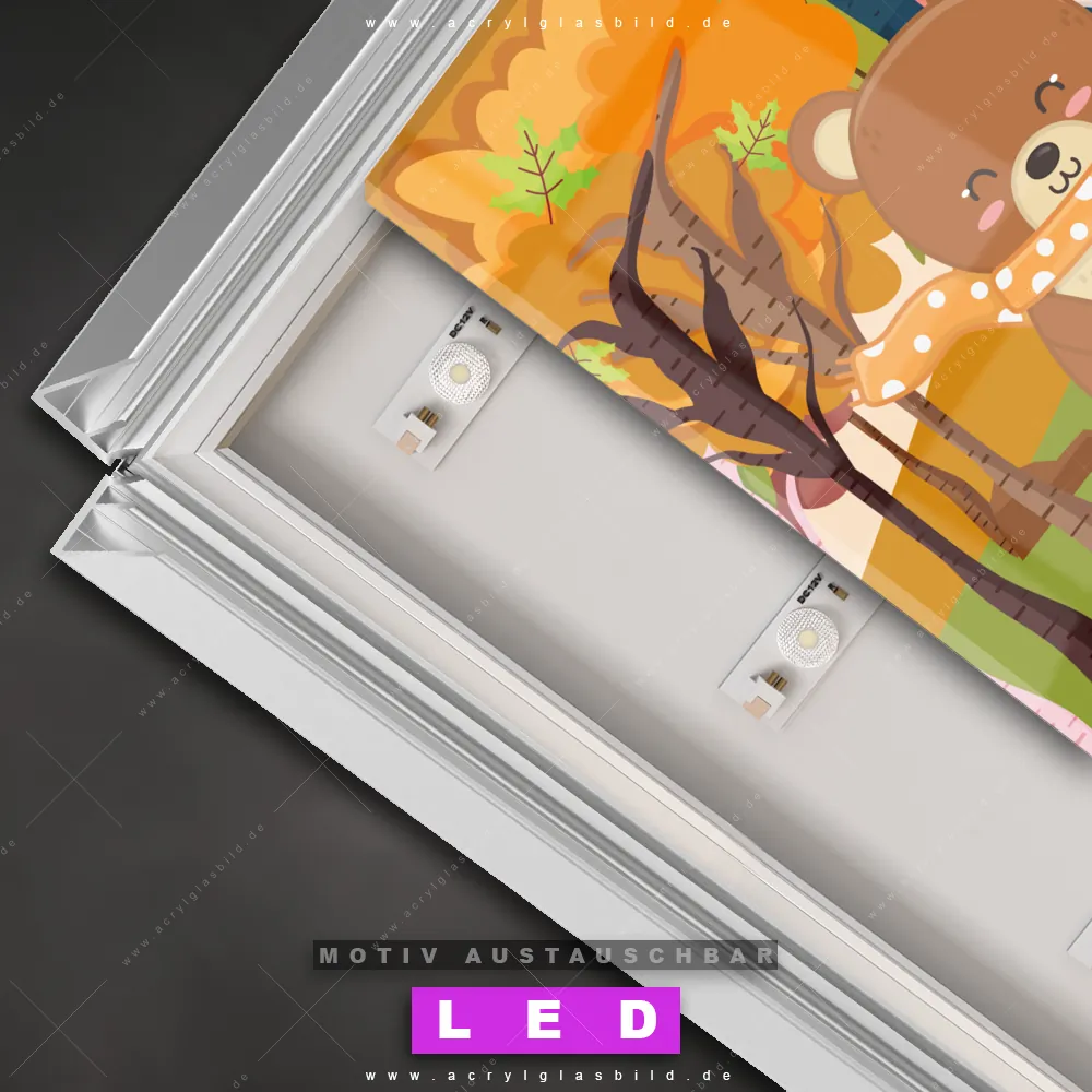 Also, worauf wartest du noch? Gib mit einem beleuchteten Wandbild mit wechselbarer Acrylglas-Scheibe deinen Wänden das gewisse Etwas und bestelle jetzt das LED Acrylglasbild Canvalight® DIA Kaninchen und Bär im Wald – dein Zuhause wird es dir danken und deine Freunde werden dank der wechselbaren Motive erblassen!