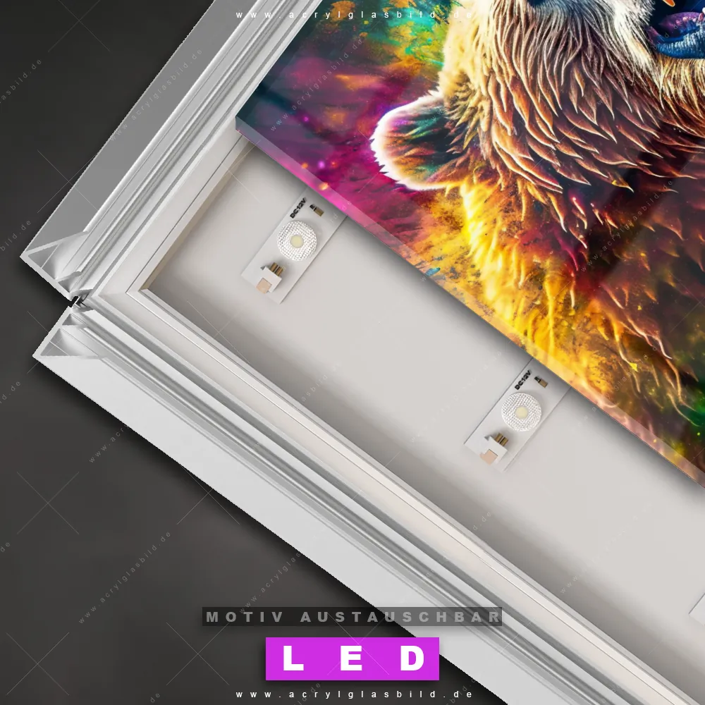 Also, worauf wartest du noch? Gib mit einem beleuchteten Wandbild mit wechselbarer Acrylglas-Scheibe deinen Wänden das gewisse Etwas und bestelle jetzt das LED Acrylglasbild Canvalight® DIA Abstrakter wilder Bär – dein Zuhause wird es dir danken und deine Freunde werden dank der wechselbaren Motive erblassen!