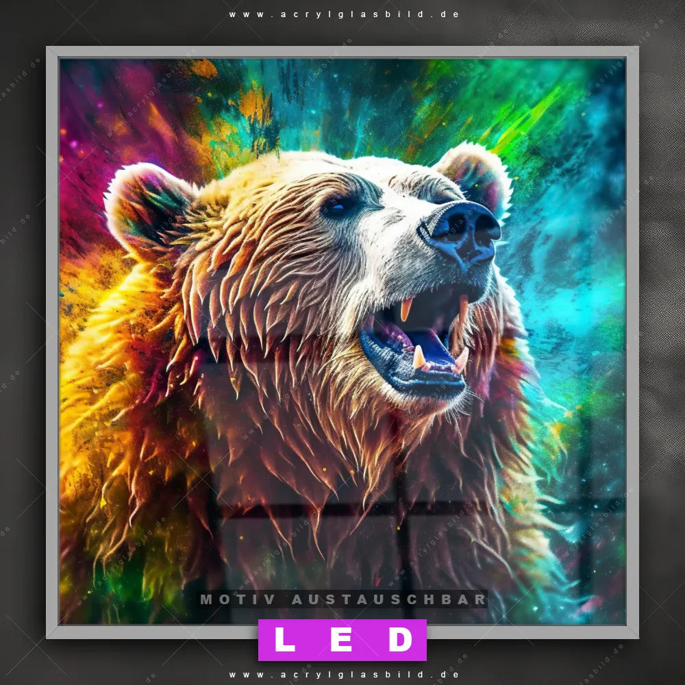 Bist du bereit, deine Wände mit einem dimmbaren LED Bild mit Fernbedienung und optionaler Farbtemperatursteuerung zum Leuchten zu bringen? Wir haben das ultimative Tierwelt LED Acrylglasbild Canvalight® DIA für dich! Unser LED Wandbild aus Acrylglas Bär in Neonfarben im Quadratischen Format mit austauschbarer bedruckter Acrylglas-Scheibe im DIA-Klapprahmen bringt sofort jede Menge Glanz in deine vier Wände.