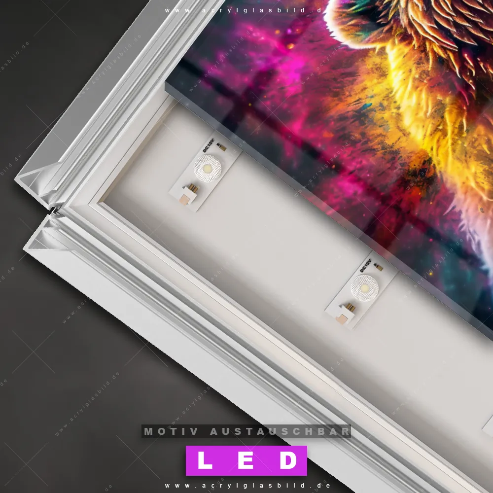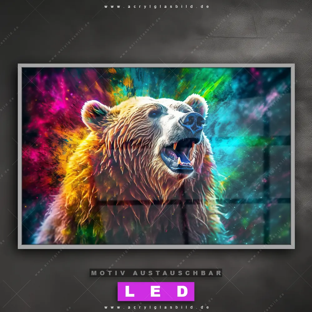 Mit unserem LED Acrylglasbild Canvalight® DIA Bunter Braunbär und seiner genialen LED-Ausleuchtung wirst du nie wieder im Dunkeln auf deinem Sofa herumtappen. Wenn du nach einem beleuchteten Wandbild aus Acrylglas mit Bär, Braunbär, Farbwolken, Farbspritzer, Wald für Wohnzimmer - Schlafzimmer, Flur - Eingangsbereich suchst, ist unser LED Leuchtbild Grizzlybär in Regenbogenfarben in den beeindruckenden Motiv-Farben Braun, Bunt genau das richtige beleuchtete Wandbild für dich. Gestaltet im Abstrakt, Pop Art Stil, passt dieses LED Wandbild mit DIA-Klapprahmen und glänzender Front aus Acrylglas perfekt zu jedem Einrichtungsstil – sogar zu deinem chaotischen kreativen Durcheinander!