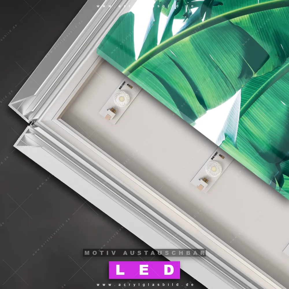 Also, worauf wartest du noch? Gib mit einem beleuchteten Wandbild mit wechselbarer Acrylglas-Scheibe deinen Wänden das gewisse Etwas und bestelle jetzt das LED Acrylglasbild Canvalight® DIA Palmblättter einer Bananenpflanze – dein Zuhause wird es dir danken und deine Freunde werden dank der wechselbaren Motive erblassen!