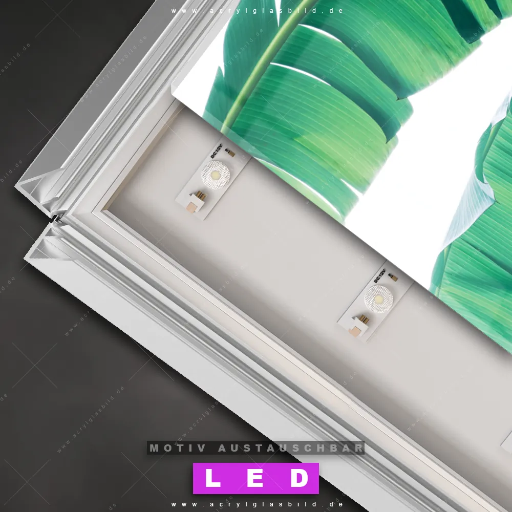 Du bist auf der Suche nach einem dimmbaren Blumen - Botanik LED Bild mit Fernbedienung und optionaler Farbtemperatursteuerung? Dann haben wir hier genau das richtige Wandbild mit LED Beleuchtung für dich: Unser Canvalight® DIA LED Acrylglasbild Bananenpalme im Querformat mit austauschbarer bedruckter Acrylglas-Scheibe. Dieses Leuchtbild bringt sofort Partybeleuchtung in deine Räume!