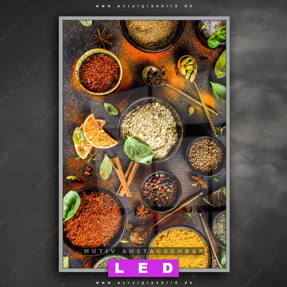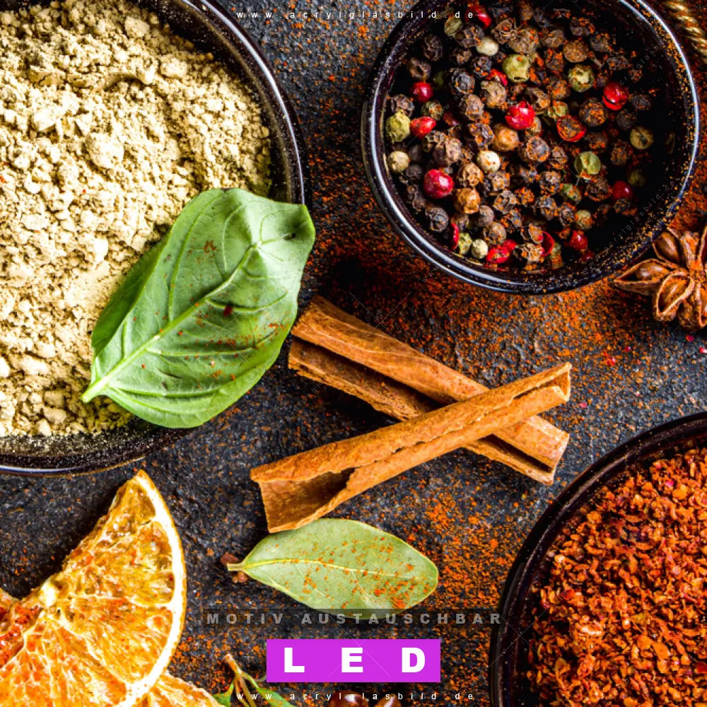 Wer braucht schon langweilige Wände, wenn man sie mit unserem LED Acrylglasbild Canvalight® DIA verschiedene Gewürzschalen aufpeppen kann? Dank der genialen LED-Ausleuchtung wirst du in Bar - Gastronomie, Küche - Esszimmer nie wieder über deine eigenen Füße stolpern. Wenn du nach einem beleuchteten Wandbild aus Acrylglas mit Gewürze, Kräuter, kochen, Chili, Pfeffer, Ingwer, Paprika, Küche, Essen, Lebensmittel suchst, dann ist unser LED Acrylglasbild Schälchen mit vielfältigen Gewürzen in den hammermäßigen Motiv-Farben Braun, Beige, Grün, Orange, Rot, Ocker, Bunt genau das richtige LED Bild für dich. Im coolen Modern Art, Natürlich - Realistisch Stil gestaltet, passt das LED Leuchtbild mit DIA-Klapprahmen und glänzender Front aus Acrylglas perfekt zu jedem Einrichtungsstil – sogar zu deinem chaotischen Kreativlabor!