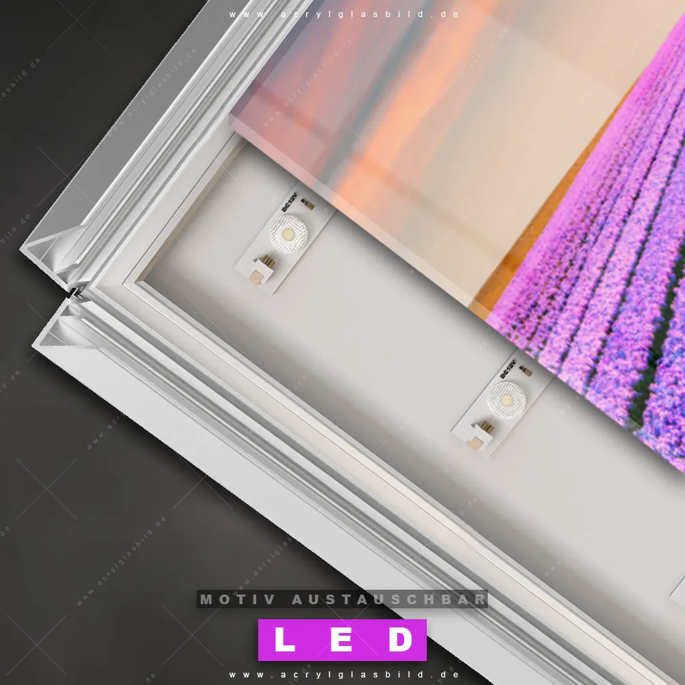 Wer will schon dunkle, triste Wände? Mit unserem LED Acrylglasbild Canvalight® DIA Lavendelfeld und seiner fantastischen LED-Ausleuchtung werden deine Wände in Arzt - Praxis, Büro - Kanzlei, Wohnzimmer - Schlafzimmer, Küche - Esszimmer zu echten Hinguckern. Wenn du auf der Suche nach einem beleuchteten Wandbild aus Acrylglas mit Blumen, Baum, Feld, Sonnenuntergang, Wiese, Himmel, Hyazinthenblumen, Hyazinthen bist, dann solltest du unser LED Leuchhtbild lilafarbenes Blumenfeld im Sonnenuntergang mit den beeindruckenden Motiv-Farben Lila, Orange nicht verpassen. Gestaltet im angesagten Floral, Natürlich - Realistisch Stil, passt das LED Bild mit DIA-Klapprahmen und wechselbarer Acrylglas-Scheibe perfekt zu jedem Einrichtungsstil – selbst in deinem kleinen Dschungel aus Kreativität und Chaos!
