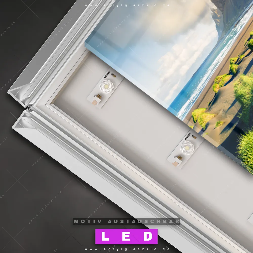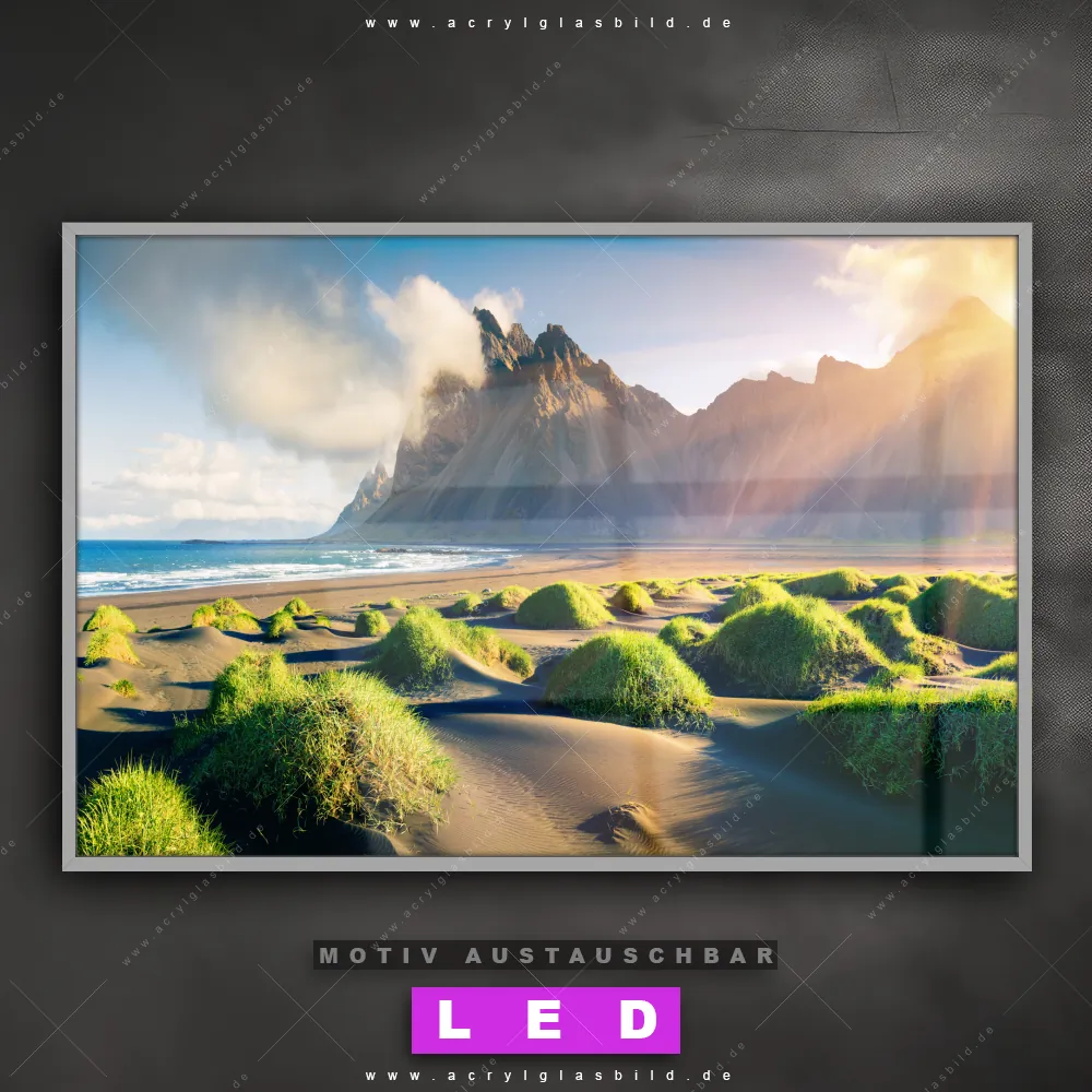 Du bist auf der Suche nach einem dimmbaren Landschaften LED Bild mit Fernbedienung und optionaler Farbtemperatursteuerung? Dann haben wir hier genau das richtige Wandbild mit LED Beleuchtung für dich: Unser Canvalight® DIA LED Acrylglasbild Beeindruckendes Island im Querformat mit austauschbarer bedruckter Acrylglas-Scheibe. Dieses Leuchtbild bringt sofort Partybeleuchtung in deine Räume!