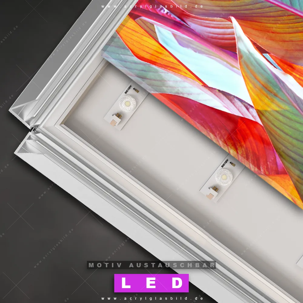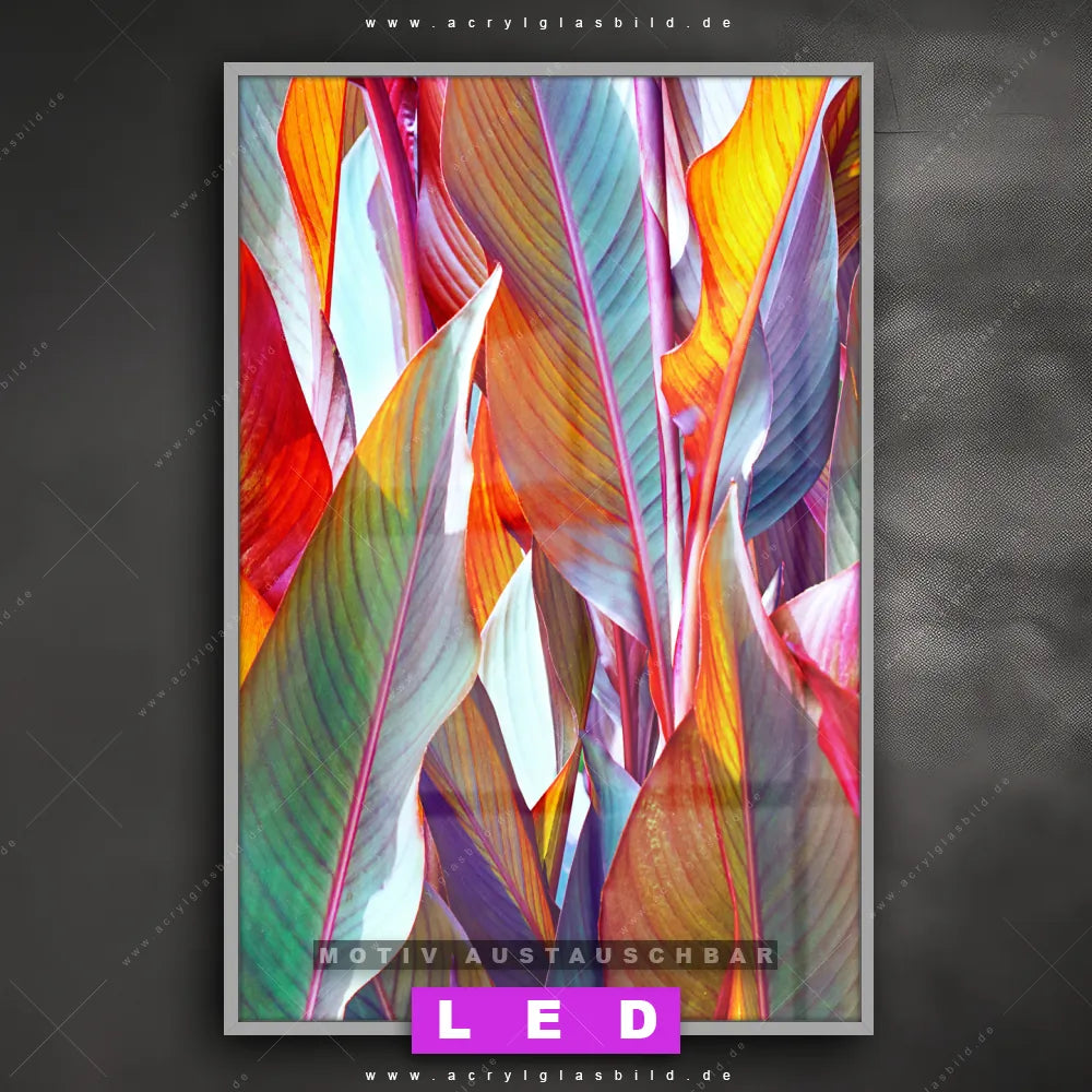 Du suchst nach einem Wandbild mit LED Beleuchtung als ultimativen Hingucker für deine Wände? Dann haben wir das perfekte dimmbare LED Bild mit Fernbedienung und optionaler Farbtemperatursteuerung für dich: unser abgefahrenes Muster - Texturen, Blumen - Botanik Canvalight® DIA LED Acrylglasbild! Mit dem LED Leuchtbild aus Acrylglas Blätter in bunten Farben im Hochformat mit austauschbarer bedruckter Acrylglas-Scheibe bringst du nicht nur Licht, sondern auch ordentlich Stil in deine Bude.