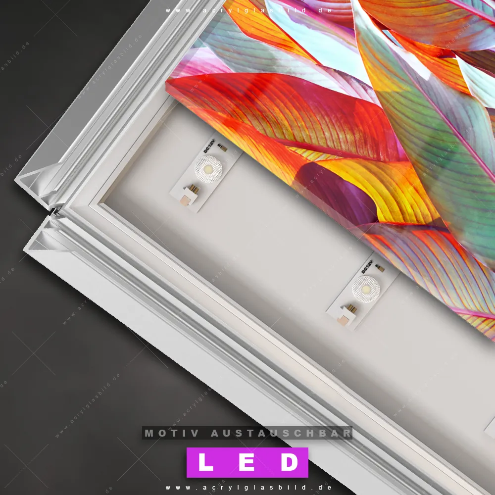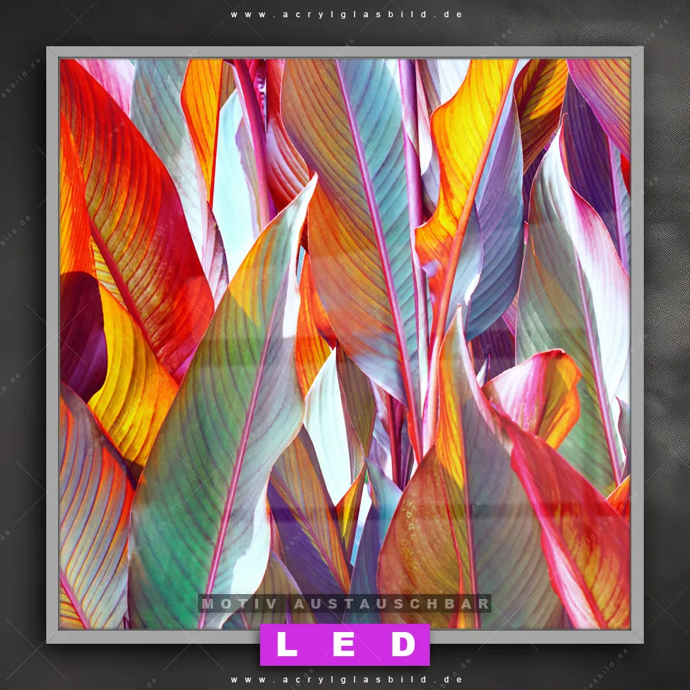 Bist du bereit, deine Wände mit einem dimmbaren LED Bild mit Fernbedienung und optionaler Farbtemperatursteuerung zum Leuchten zu bringen? Wir haben das ultimative Muster - Texturen, Blumen - Botanik LED Acrylglasbild Canvalight® DIA für dich! Unser LED Wandbild aus Acrylglas Blätter in bunten Farben im Quadratischen Format mit austauschbarer bedruckter Acrylglas-Scheibe im DIA-Klapprahmen bringt sofort jede Menge Glanz in deine vier Wände.