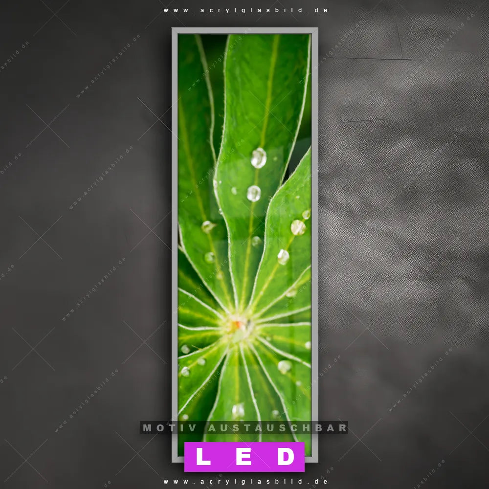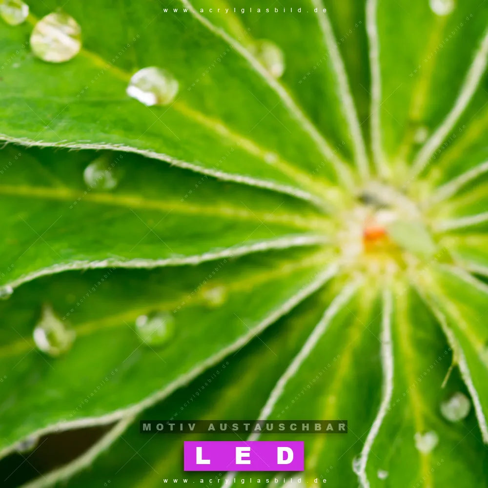 Bist du bereit, deine Wände mit einem dimmbaren LED Bild mit Fernbedienung und optionaler Farbtemperatursteuerung auf das nächste Level zu bringen? Unser Blumen - Botanik Canvalight® DIA LED Acrylglasbild ist genau das, was du brauchst! Das Wandbild mit LED Beleuchtung im Schmalen Format mit austauschbarer bedruckter Acrylglas-Scheibe Blatt mit Wassertropfen bringt Licht und Stil in dein Zuhause – und das in null Komma nichts!