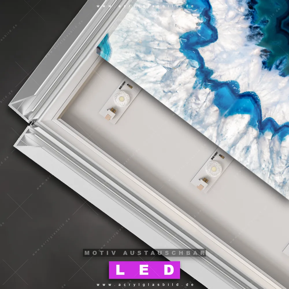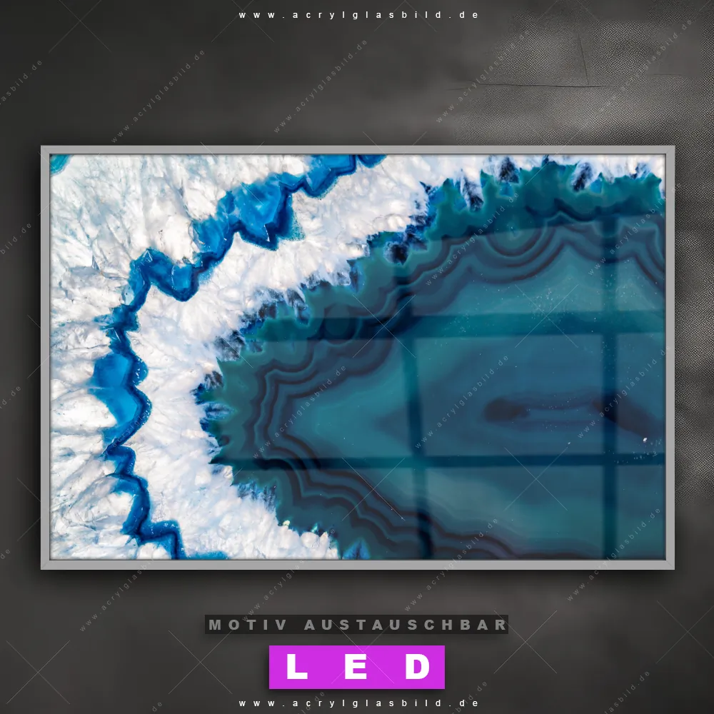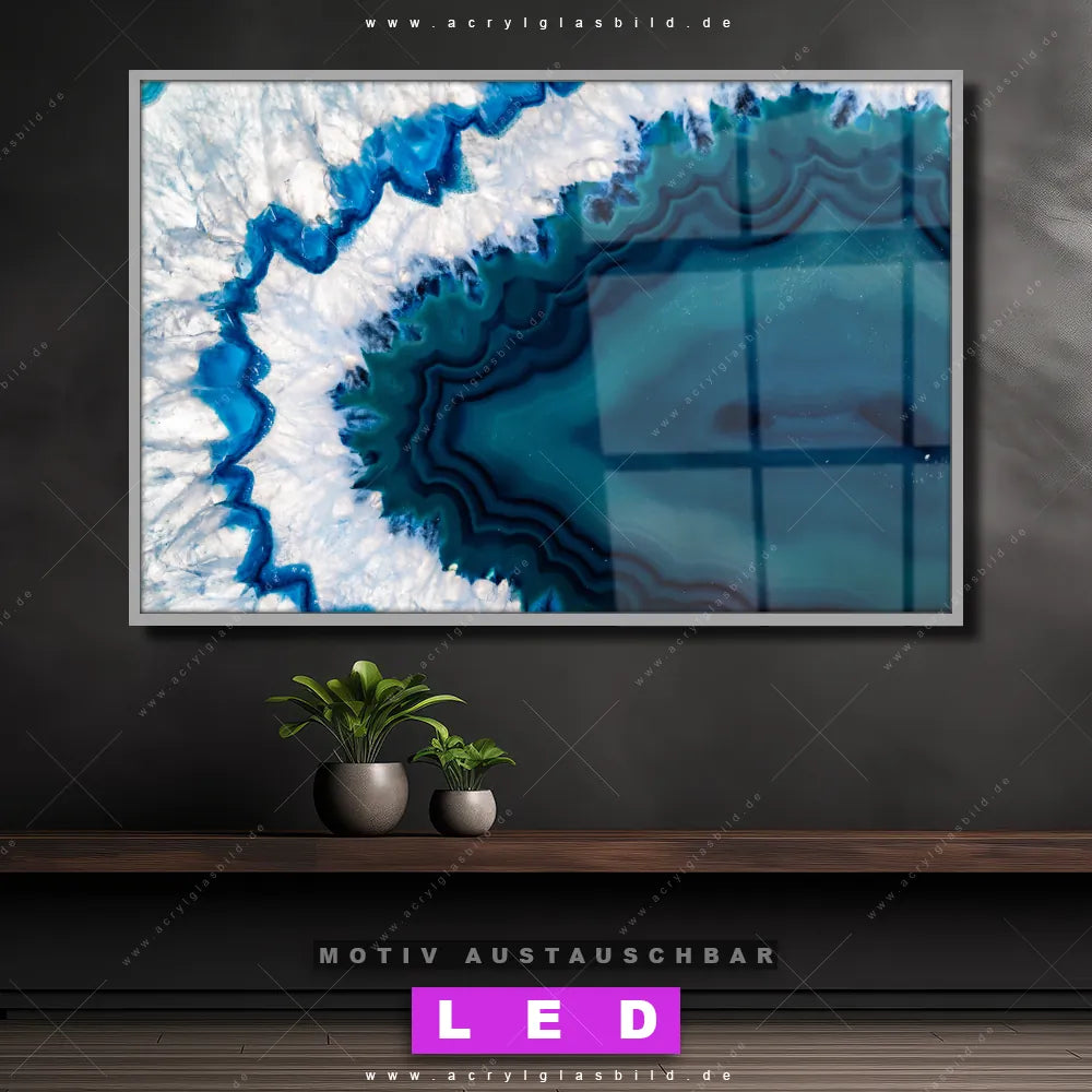 Du bist auf der Suche nach einem dimmbaren Muster - Texturen LED Bild mit Fernbedienung und optionaler Farbtemperatursteuerung? Dann haben wir hier genau das richtige Wandbild mit LED Beleuchtung für dich: Unser Canvalight® DIA LED Acrylglasbild Blauer Achat im Querformat mit austauschbarer bedruckter Acrylglas-Scheibe. Dieses Leuchtbild bringt sofort Partybeleuchtung in deine Räume!