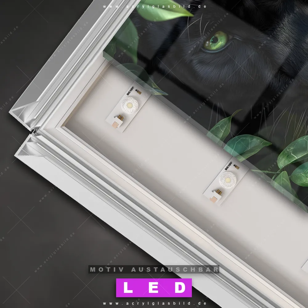 Also, worauf wartest du noch? Gib mit einem beleuchteten Wandbild mit wechselbarer Acrylglas-Scheibe deinen Wänden das gewisse Etwas und bestelle jetzt das LED Acrylglasbild Canvalight® DIA Geheimnisvolle Dschungelkatze – dein Zuhause wird es dir danken und deine Freunde werden dank der wechselbaren Motive erblassen!