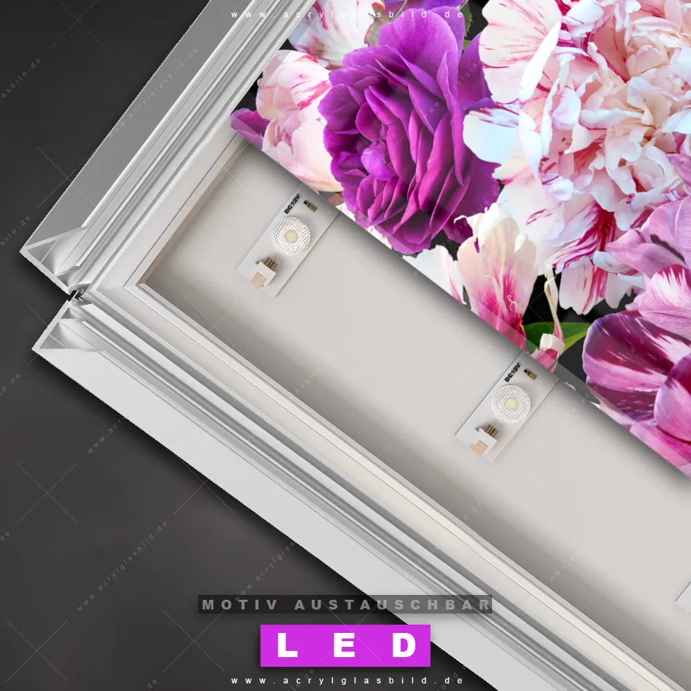 Also, worauf wartest du noch? Gib mit einem beleuchteten Wandbild mit wechselbarer Acrylglas-Scheibe deinen Wänden das gewisse Etwas und bestelle jetzt das LED Acrylglasbild Canvalight® DIA vielfältige Blüten von Pfingstrosen – dein Zuhause wird es dir danken und deine Freunde werden dank der wechselbaren Motive erblassen!