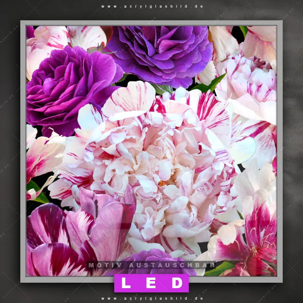 Vergiss dunkle Ecken und Langeweile! Mit unserem Acrylglasbild Blüten in rosa, lila, pink und weiß und seiner brillanten LED-Ausleuchtung wirst du dich nie wieder in der Dunkelheit verirren. Wenn du auf der Suche nach einem beleuchteten Wandbild aus Acrylglas mit Pflanze, Natur, Blüte, Nahaufnahme, Draufsicht, vintage, Blumen, Rosen, Blüten, Pfingstrosen, Blumenstrauß bist, ist unser LED Acrylglasbild Canvalight® DIA Blütenzauber in femininen Farben mit den strahlenden Motiv-Farben Pink, Rosa, Lila, Weiss, Grün genau das richtige Leuchtbild für dich. Das im Floral, Natürlich - Realistisch Stil gestaltete LED Bild mit glänzender Front aus Acrylglas passt perfekt zu jedem Einrichtungsstil in Arzt - Praxis, Büro - Kanzlei, Wohnzimmer - Schlafzimmer, Flur - Eingangsbereich – vom minimalistischen Chic bis zum kreativen Chaos.