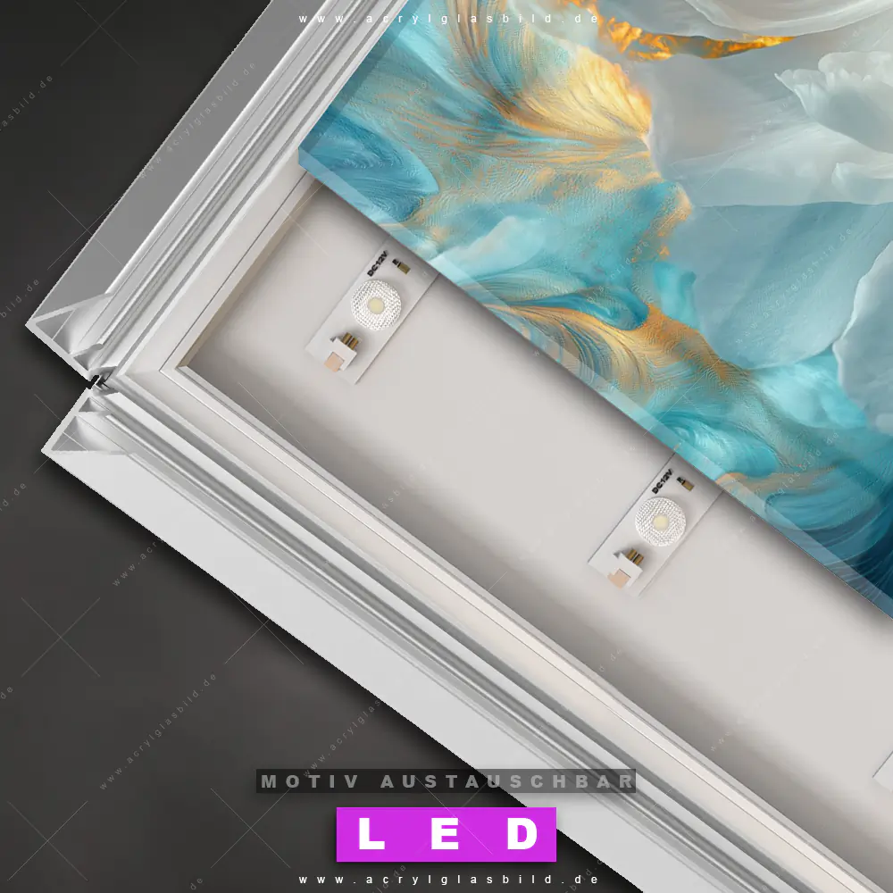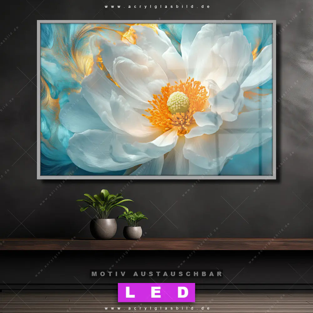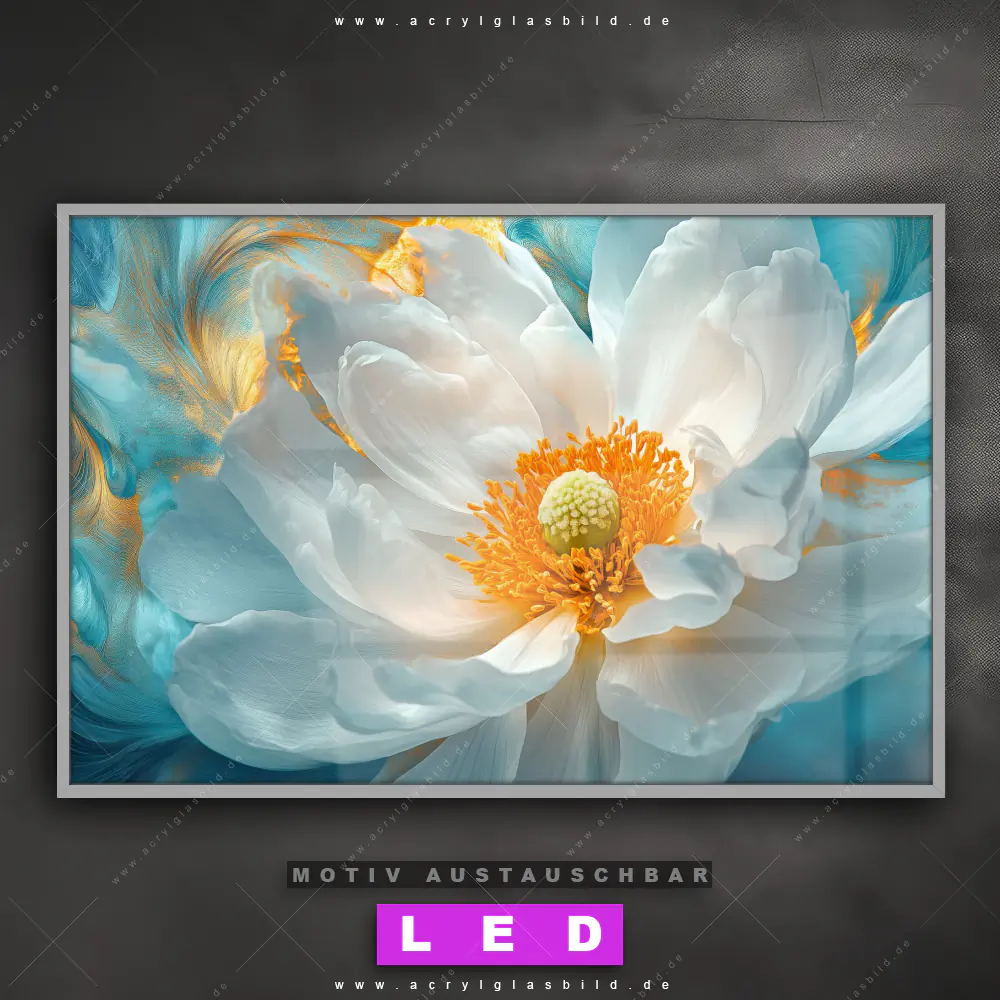 Mit unserem LED Acrylglasbild Canvalight® DIA Eleganz der weißen Blume und seiner genialen LED-Ausleuchtung wirst du nie wieder im Dunkeln auf deinem Sofa herumtappen. Wenn du nach einem beleuchteten Wandbild aus Acrylglas mit Pflanze, Natur, Nahaufnahme, Draufsicht, Rose, Blumen, Blüten, Fluid Art für Arzt - Praxis, Flur - Eingangsbereich, Wohnzimmer - Schlafzimmer suchst, ist unser LED Leuchtbild Anmutige Florale Schönheit in den beeindruckenden Motiv-Farben Gold, Orange, Türkis, Weiss genau das richtige beleuchtete Wandbild für dich. Gestaltet im Floral, Modern Art Stil, passt dieses LED Wandbild mit DIA-Klapprahmen und glänzender Front aus Acrylglas perfekt zu jedem Einrichtungsstil – sogar zu deinem chaotischen kreativen Durcheinander!