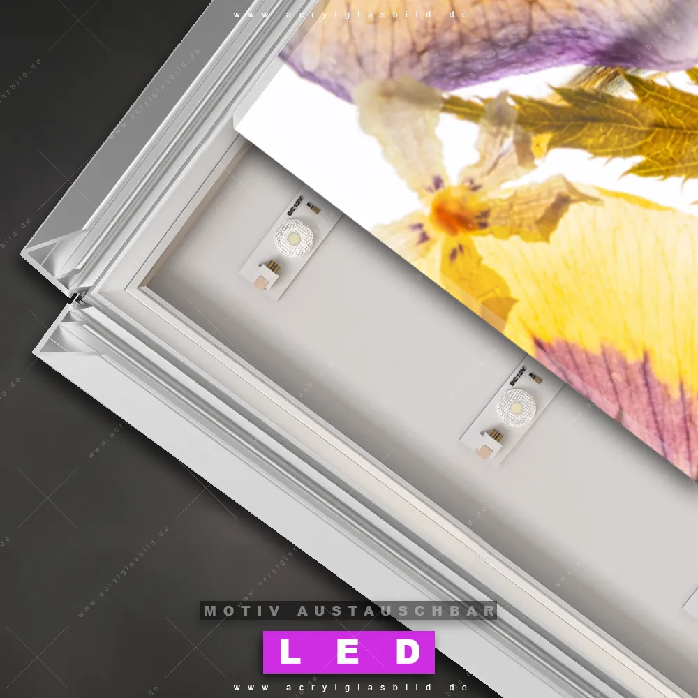 Bist du bereit, deine Wände mit einem dimmbaren LED Bild mit Fernbedienung und optionaler Farbtemperatursteuerung auf das nächste Level zu bringen? Unser Blumen - Botanik Canvalight® DIA LED Acrylglasbild ist genau das, was du brauchst! Das Wandbild mit LED Beleuchtung im Schmalen Format mit austauschbarer bedruckter Acrylglas-Scheibe Blumen Collage No.1 bringt Licht und Stil in dein Zuhause – und das in null Komma nichts!