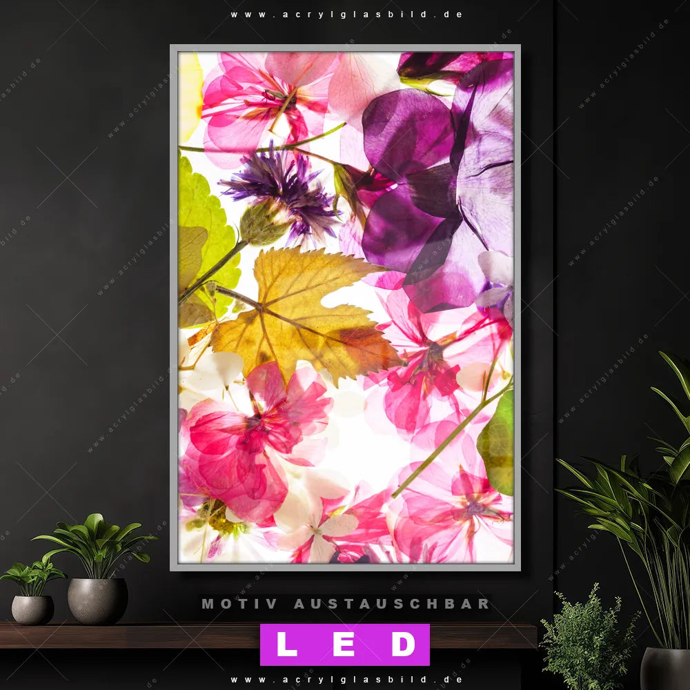 Du suchst nach einem Wandbild mit LED Beleuchtung als ultimativen Hingucker für deine Wände? Dann haben wir das perfekte dimmbare LED Bild mit Fernbedienung und optionaler Farbtemperatursteuerung für dich: unser abgefahrenes Blumen - Botanik Canvalight® DIA LED Acrylglasbild! Mit dem LED Leuchtbild aus Acrylglas Blumen Collage No.2 im Hochformat mit austauschbarer bedruckter Acrylglas-Scheibe bringst du nicht nur Licht, sondern auch ordentlich Stil in deine Bude.