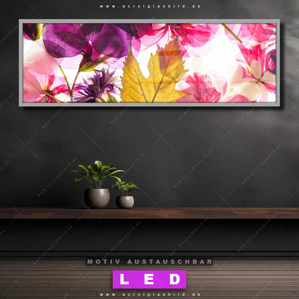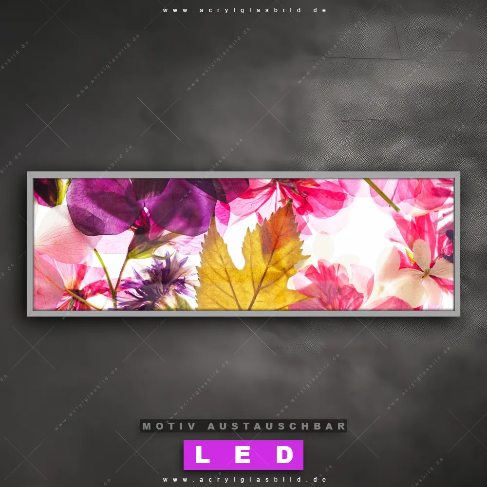 Wer will schon dunkle, triste Wände? Mit unserem LED Acrylglasbild Canvalight® DIA farbenfrohe Blumen und seiner fantastischen LED-Ausleuchtung werden deine Wände in Arzt - Praxis, Büro - Kanzlei, Wohnzimmer - Schlafzimmer zu echten Hinguckern. Wenn du auf der Suche nach einem beleuchteten Wandbild aus Acrylglas mit Pflanze, Natur, Blüte, Nahaufnahme, Draufsicht, vintage, Blumen, Blätter bist, dann solltest du unser LED Leuchhtbild bunte Blätter und Blüten mit den beeindruckenden Motiv-Farben Beige, Braun, Orange, Ocker, Lila nicht verpassen. Gestaltet im angesagten Floral, Natürlich - Realistisch, Mixed Media Stil, passt das LED Bild mit DIA-Klapprahmen und wechselbarer Acrylglas-Scheibe perfekt zu jedem Einrichtungsstil – selbst in deinem kleinen Dschungel aus Kreativität und Chaos!