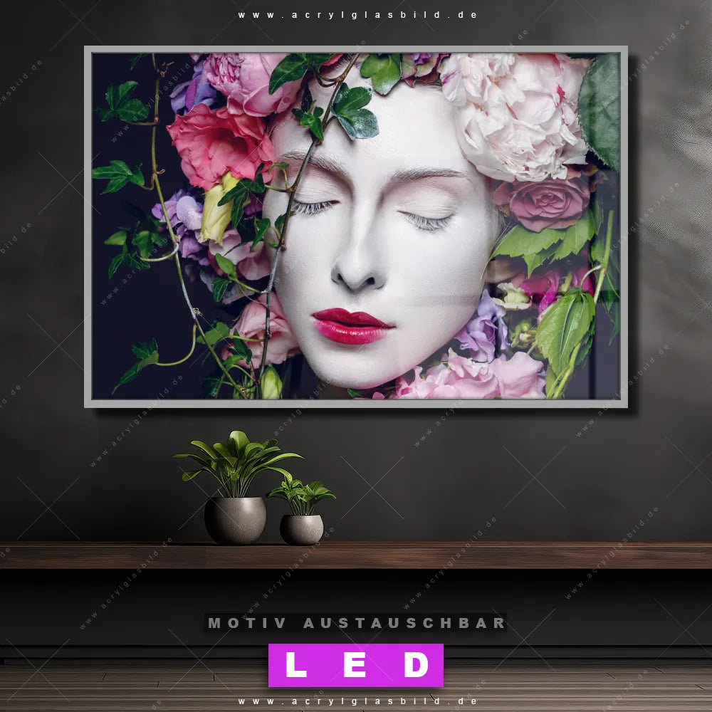 Mit unserem LED Acrylglasbild Canvalight® DIA Frau mit Blumenhaar und seiner genialen LED-Ausleuchtung wirst du nie wieder im Dunkeln auf deinem Sofa herumtappen. Wenn du nach einem beleuchteten Wandbild aus Acrylglas mit Menschen & Blumen, Frau, Porträt, modern, Beauty, Gesicht, Blumen, Blüten, Schönheit, Mode für Bar - Gastronomie, Friseur - Beauty, Wohnzimmer - Schlafzimmer suchst, ist unser LED Leuchtbild Blütenpracht als Haar in den beeindruckenden Motiv-Farben Schwarz, Weiss, Grün, Rosa, Rot, Lila genau das richtige beleuchtete Wandbild für dich. Gestaltet im Modern Art, Floral Stil, passt dieses LED Wandbild mit DIA-Klapprahmen und glänzender Front aus Acrylglas perfekt zu jedem Einrichtungsstil – sogar zu deinem chaotischen kreativen Durcheinander!
