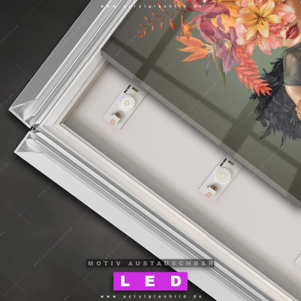 Du suchst nach einem Wandbild mit LED Beleuchtung als ultimativen Hingucker für deine Wände? Dann haben wir das perfekte dimmbare LED Bild mit Fernbedienung und optionaler Farbtemperatursteuerung für dich: unser abgefahrenes Porträts - Menschen, Blumen - Botanik Canvalight® DIA LED Acrylglasbild! Mit dem LED Leuchtbild aus Acrylglas Blumenportrait einer Frau im Hochformat mit austauschbarer bedruckter Acrylglas-Scheibe bringst du nicht nur Licht, sondern auch ordentlich Stil in deine Bude.