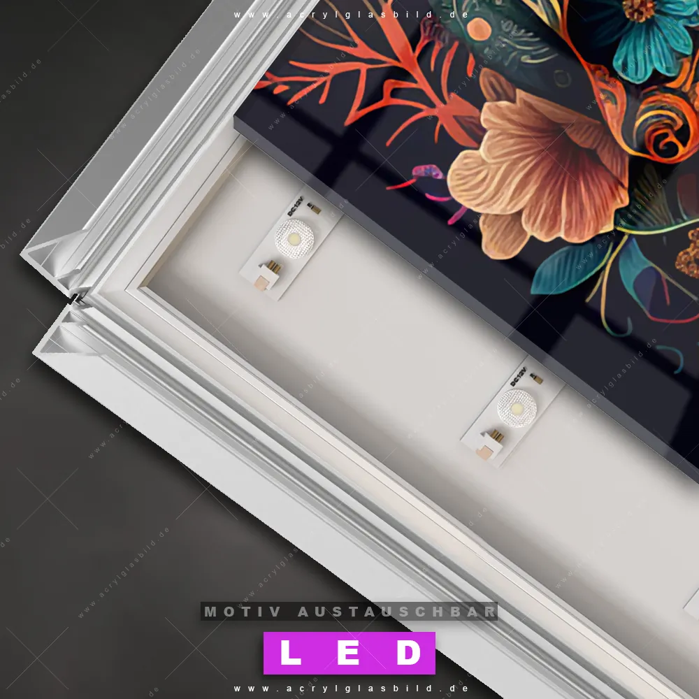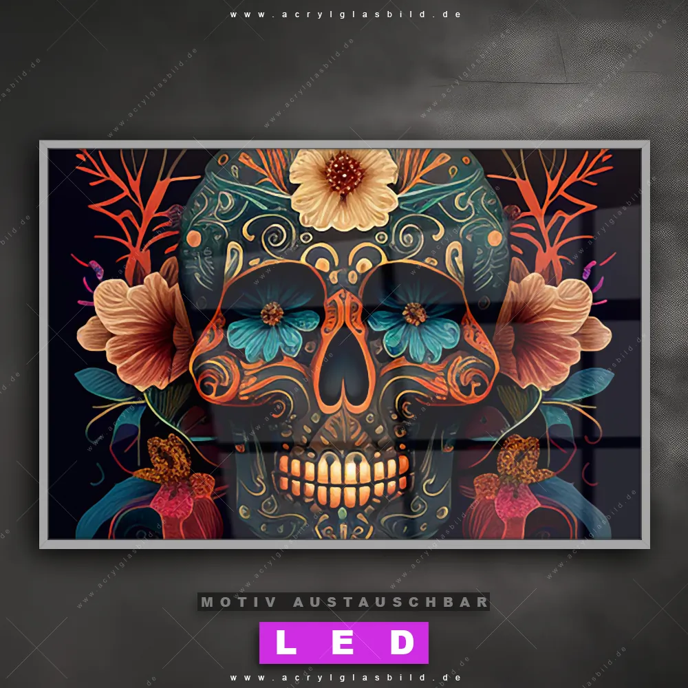 Du bist auf der Suche nach einem dimmbaren Porträts - Menschen, Blumen - Botanik LED Bild mit Fernbedienung und optionaler Farbtemperatursteuerung? Dann haben wir hier genau das richtige Wandbild mit LED Beleuchtung für dich: Unser Canvalight® DIA LED Acrylglasbild Blumenschädel schwarz im Querformat mit austauschbarer bedruckter Acrylglas-Scheibe. Dieses Leuchtbild bringt sofort Partybeleuchtung in deine Räume!