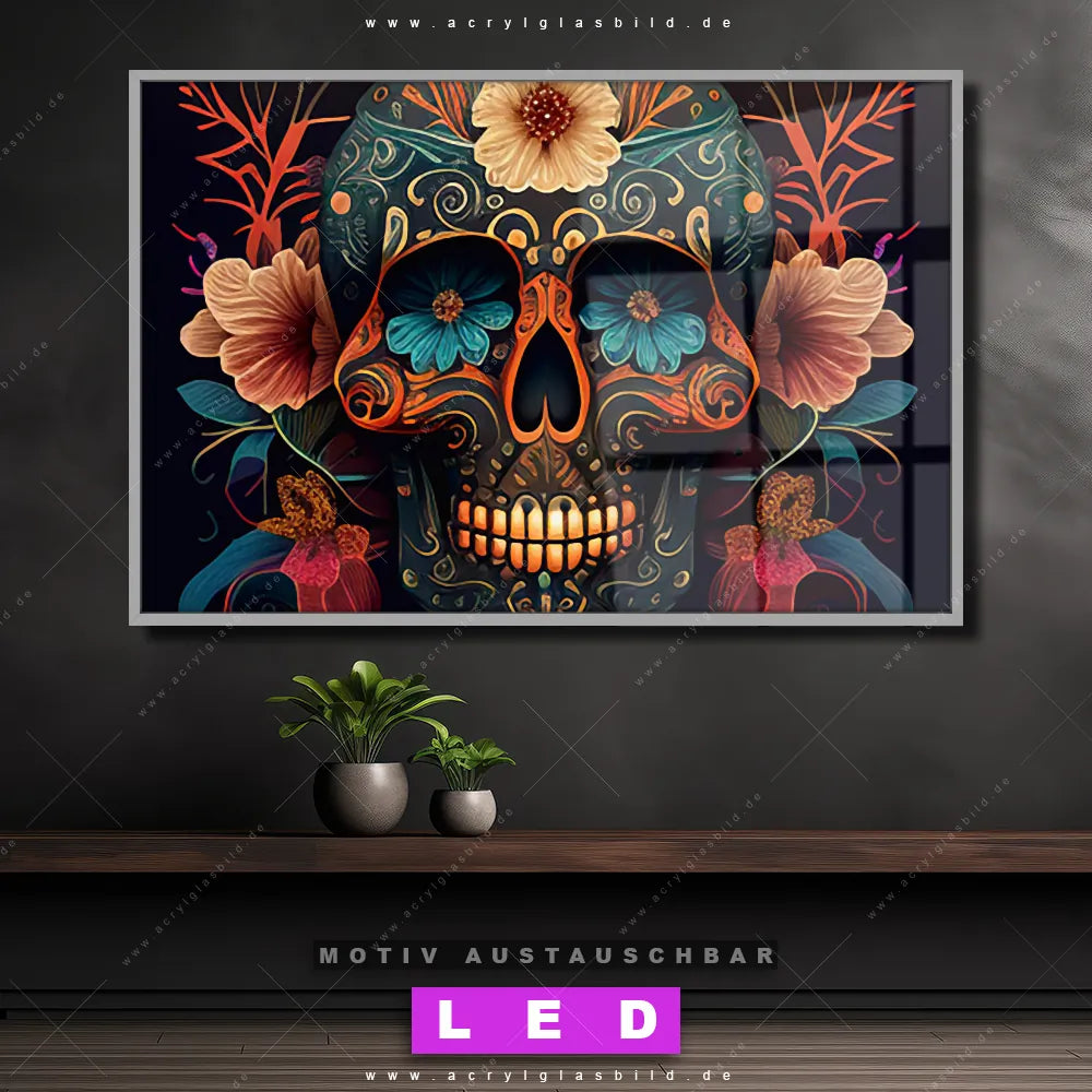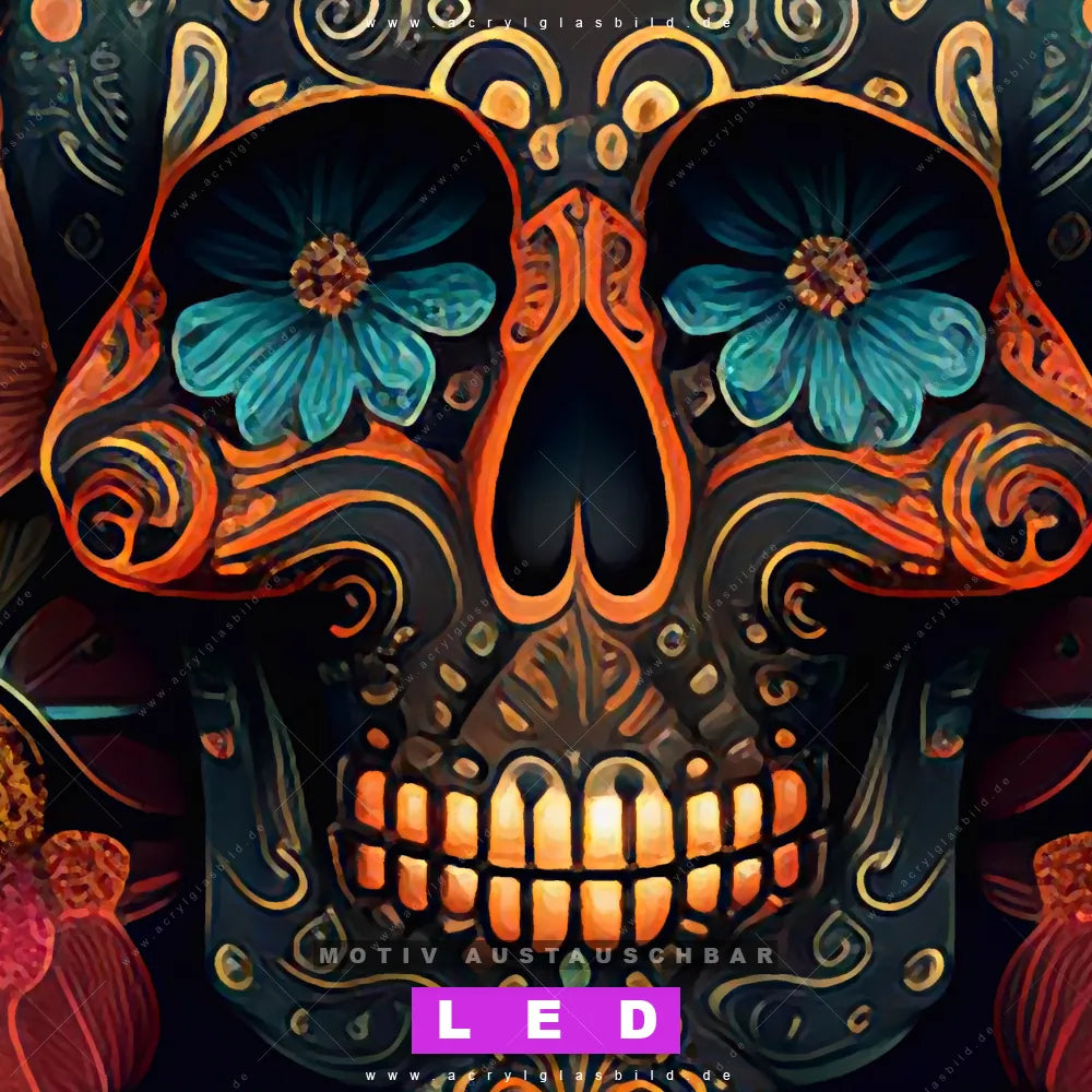 Mit unserem LED Acrylglasbild Canvalight® DIA verzierter Totenkopf und seiner genialen LED-Ausleuchtung wirst du nie wieder im Dunkeln auf deinem Sofa herumtappen. Wenn du nach einem beleuchteten Wandbild aus Acrylglas mit Schädel, Totenkopf, Skelett, Skull, Knochen, Blumen, Blüten, Blätter für Bar - Gastronomie, Wohnzimmer - Schlafzimmer suchst, ist unser LED Leuchtbild Totenkopf mit Blumen in den beeindruckenden Motiv-Farben Gold, Schwarz, Rot, Türkis, Bunt, Orange genau das richtige beleuchtete Wandbild für dich. Gestaltet im Modern Art, Floral Stil, passt dieses LED Wandbild mit DIA-Klapprahmen und glänzender Front aus Acrylglas perfekt zu jedem Einrichtungsstil – sogar zu deinem chaotischen kreativen Durcheinander!