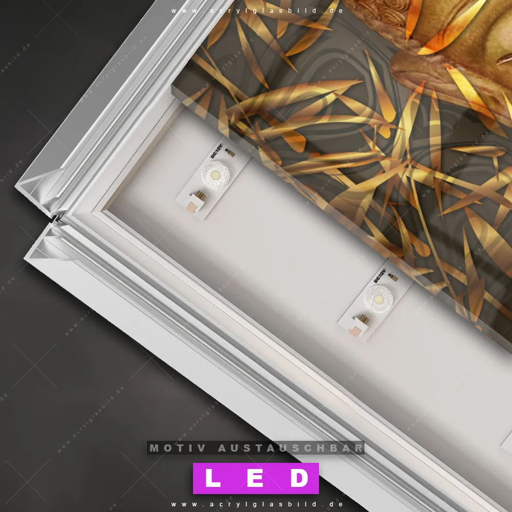 Du bist auf der Suche nach einem dimmbaren Buddha - Feng Shui LED Bild mit Fernbedienung und optionaler Farbtemperatursteuerung? Dann haben wir hier genau das richtige Wandbild mit LED Beleuchtung für dich: Unser Canvalight® DIA LED Acrylglasbild Buddha & Bambus in Gold im Querformat mit austauschbarer bedruckter Acrylglas-Scheibe. Dieses Leuchtbild bringt sofort Partybeleuchtung in deine Räume!