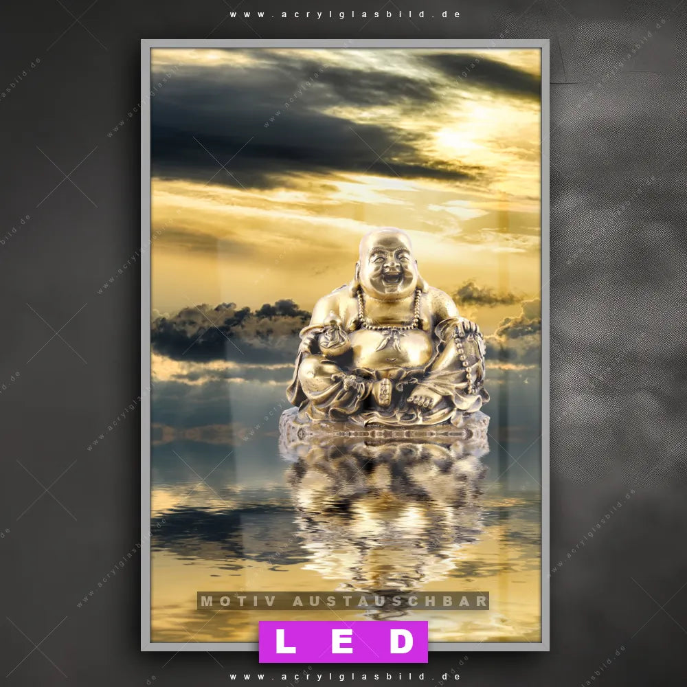 Wer braucht schon langweilige Wände, wenn man sie mit unserem LED Acrylglasbild Canvalight® DIA Lachender Buddha aufpeppen kann? Dank der genialen LED-Ausleuchtung wirst du in Arzt - Praxis, Wohnzimmer - Schlafzimmer, Friseur - Beauty, Büro - Kanzlei nie wieder über deine eigenen Füße stolpern. Wenn du nach einem beleuchteten Wandbild aus Acrylglas mit Buddha, Buddhismus, Religion, Feng Shui, Zen, Meditation, spirituell, heilig, Esoterik, Gott, Gesicht, Statue, Himmel, Wolken, Sonnenuntergang, Sonnenaufgang, Wasserspiegelung, Spiegelung suchst, dann ist unser LED Acrylglasbild Buddha-Figur mit Wasserspiegelung in den hammermäßigen Motiv-Farben Gold, Ocker, Orange, Blau genau das richtige LED Bild für dich. Im coolen Mixed Media, Modern Art Stil gestaltet, passt das LED Leuchtbild mit DIA-Klapprahmen und glänzender Front aus Acrylglas perfekt zu jedem Einrichtungsstil – sogar zu deinem chaotischen Kreativlabor!