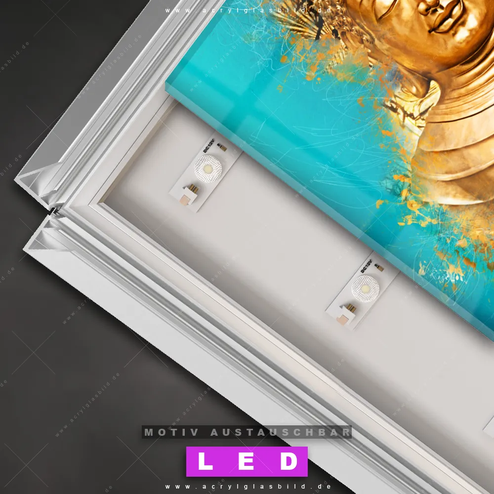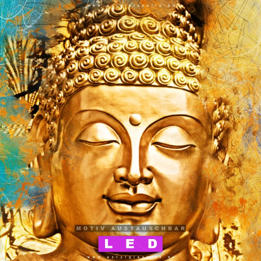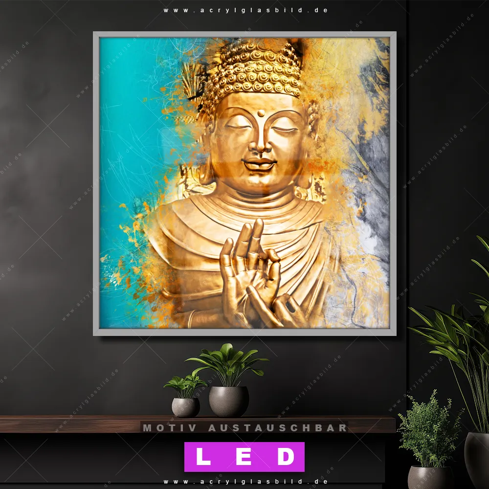 Bist du bereit, deine Wände mit einem dimmbaren LED Bild mit Fernbedienung und optionaler Farbtemperatursteuerung zum Leuchten zu bringen? Wir haben das ultimative Buddha - Feng Shui LED Acrylglasbild Canvalight® DIA für dich! Unser LED Wandbild aus Acrylglas Buddha Gold & Türkis im Quadratischen Format mit austauschbarer bedruckter Acrylglas-Scheibe im DIA-Klapprahmen bringt sofort jede Menge Glanz in deine vier Wände.